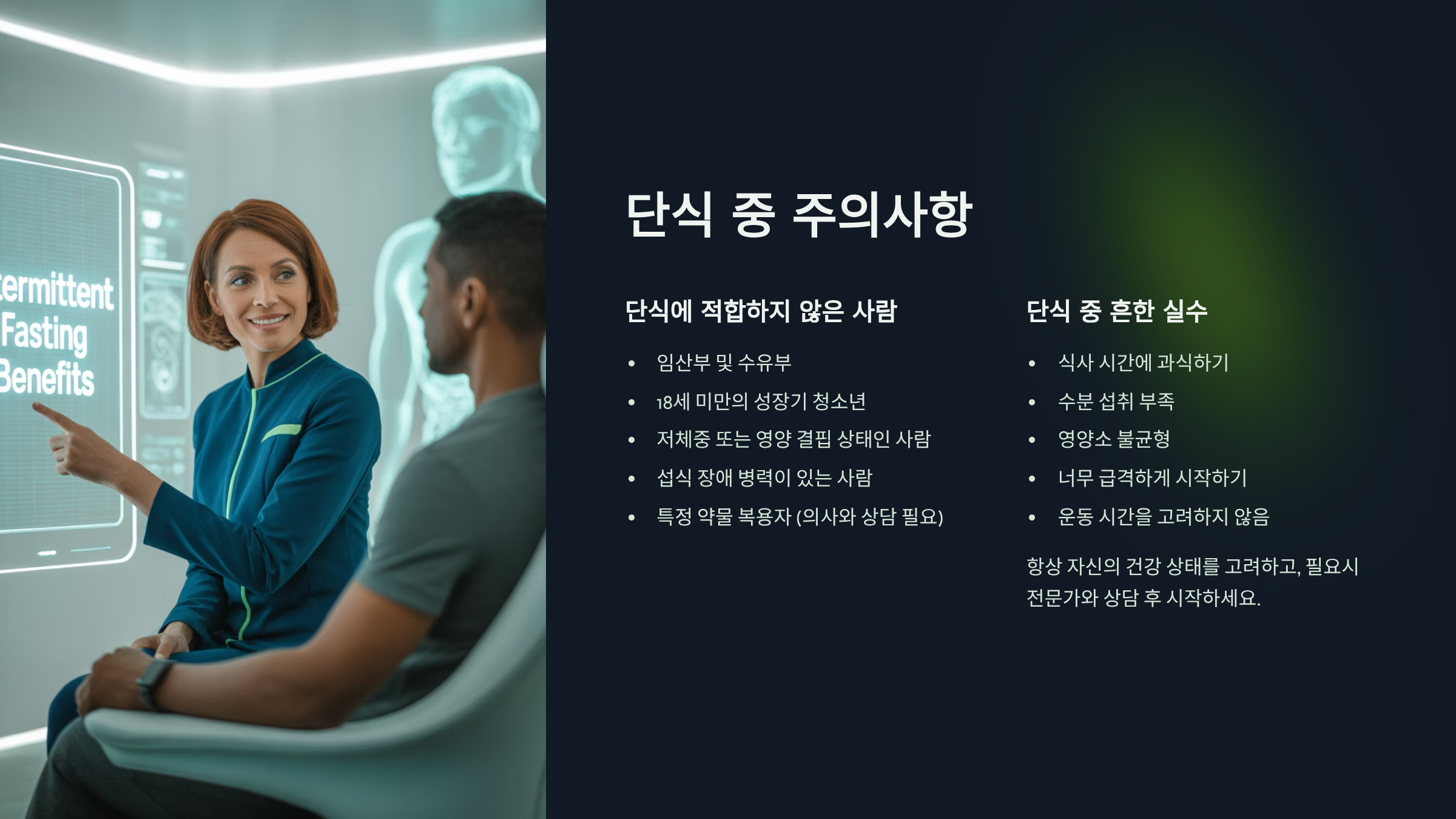 **장점**은 비교적 부담 없이 시작할 수 있고, 식사 시간을 명확히 제한해 **칼로리 섭취를 자연스럽게 줄일 수 있다는 점**입니다. 직장인 A 씨는 점심-저녁만 먹는 방식으로 한 달 만에 **체중 3kg 감량**과 **혈당 안정** 효과를 경험했습니다.