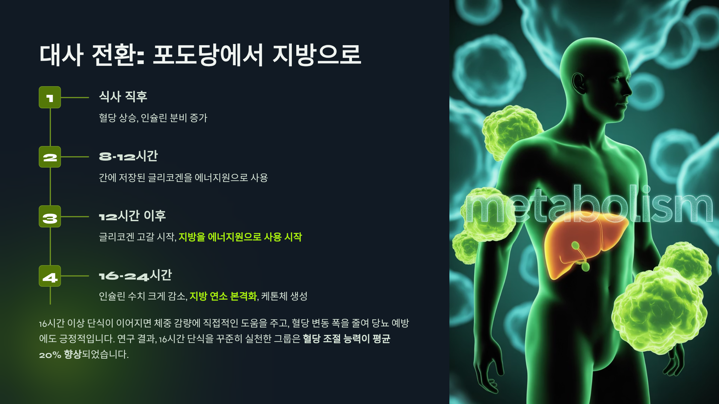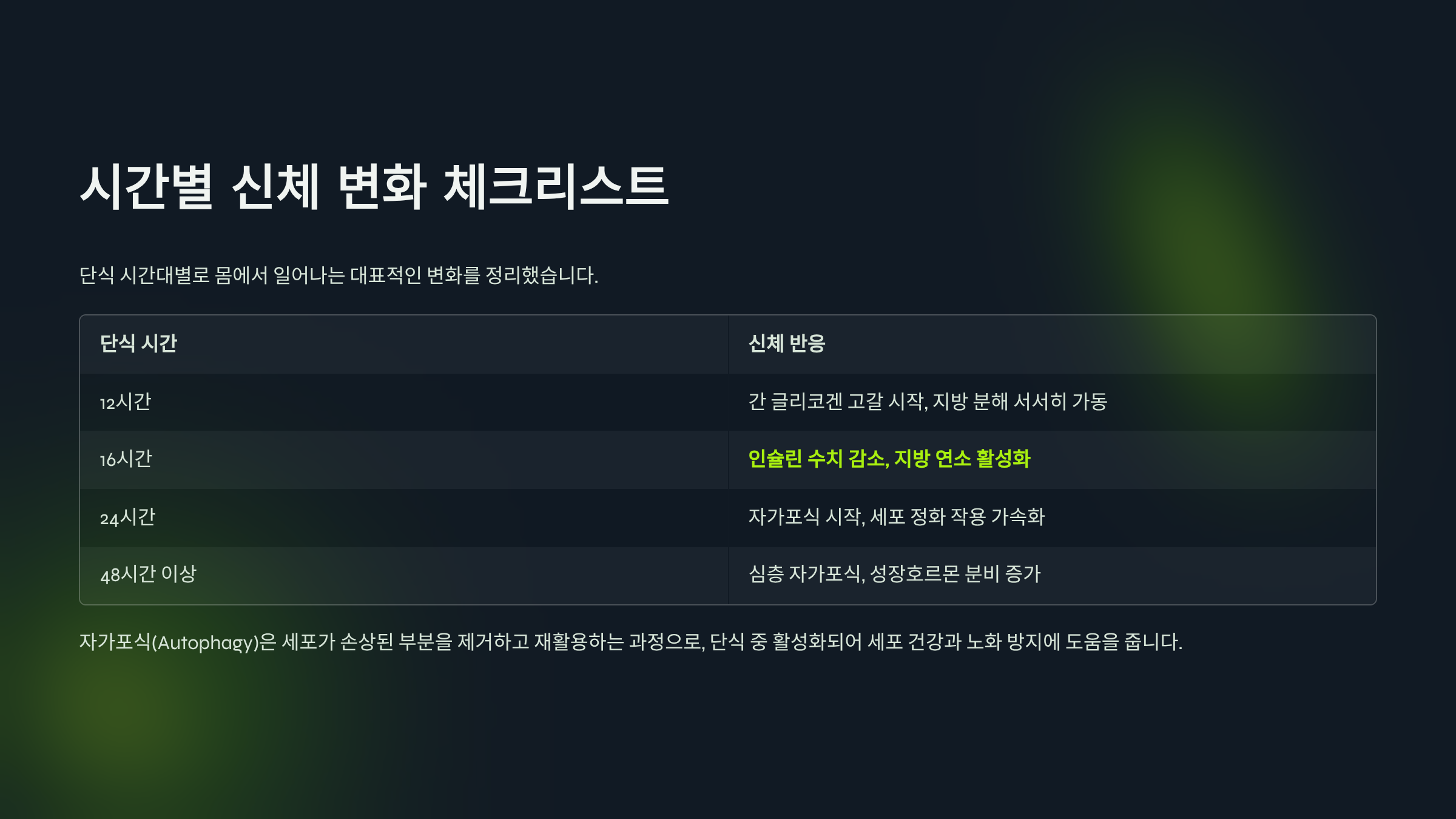 | 16시간 | 인슐린 수치 감소, 지방 연소 활성화 |