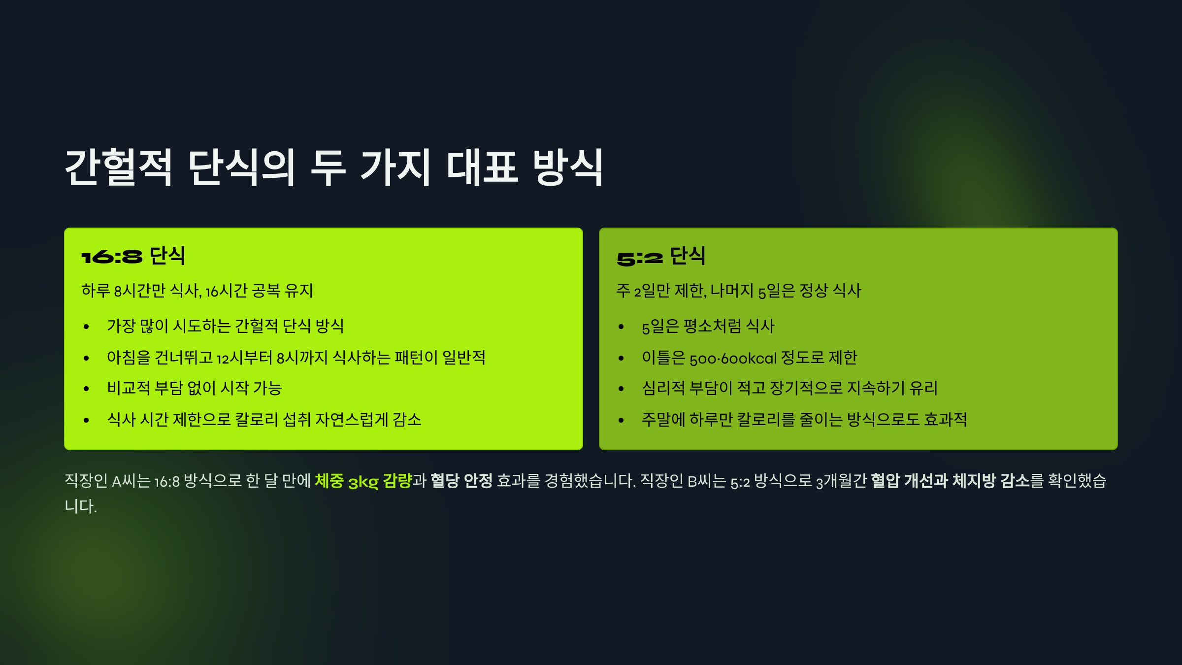 예를 들어 직장인 B 씨는 주말에 하루만 칼로리를 줄여 **간단한 요구르트·채소·계란**만 섭취했는데, 3개월간 **혈압 개선과 체지방 감소**를 확인할 수 있었습니다.