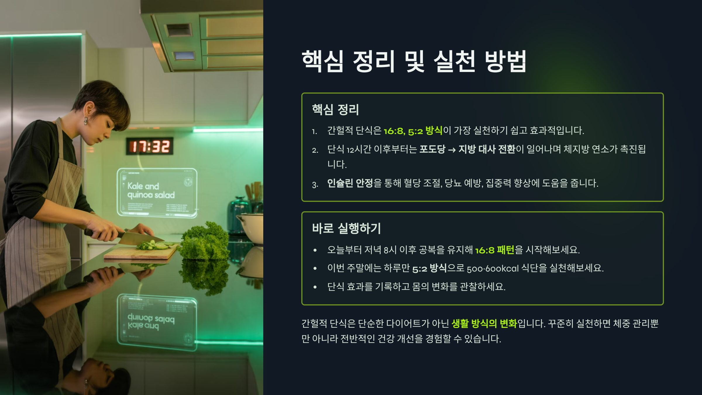 - 간헐적 단식은 **16:8, 5:2 방식**이 가장 실천하기 쉽고 효과적입니다.