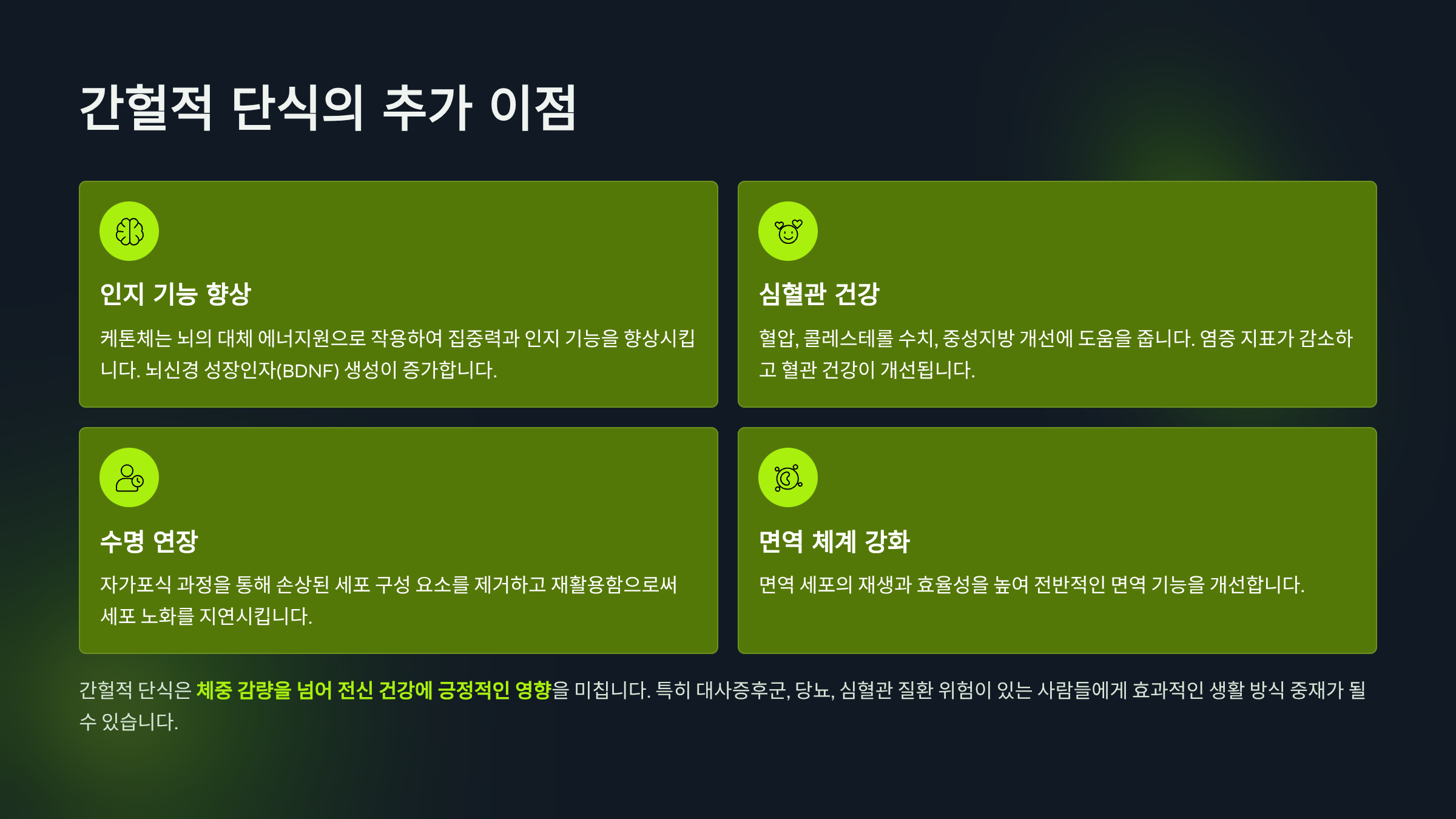 > 미국 국립보건원(NIH) 연구: 간헐적 단식을 8주간 실시한 그룹에서 **공복 인슐린이 평균 30% 감소**.