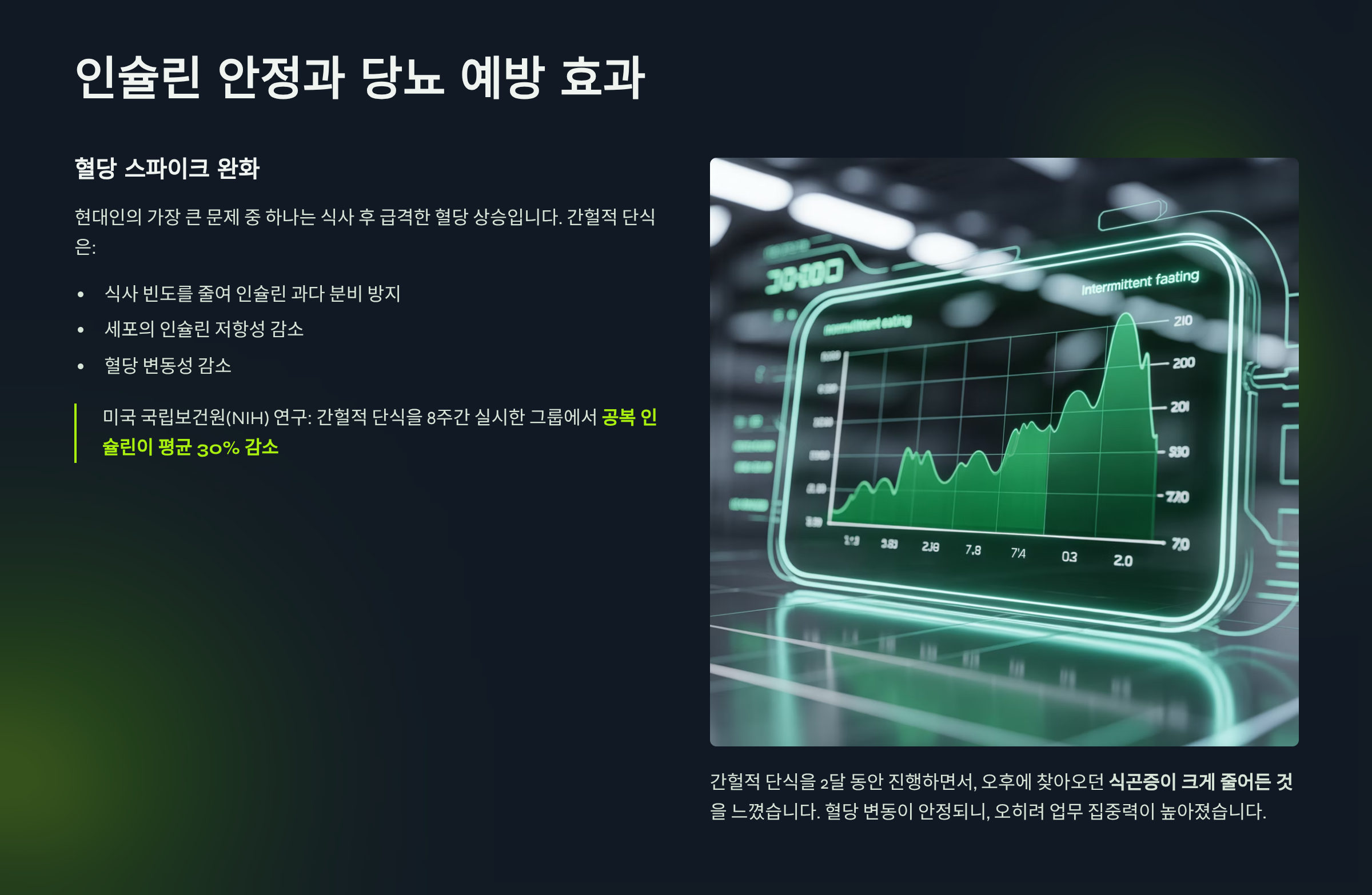 > 미국 국립보건원(NIH) 연구: 간헐적 단식을 8주간 실시한 그룹에서 **공복 인슐린이 평균 30% 감소**.