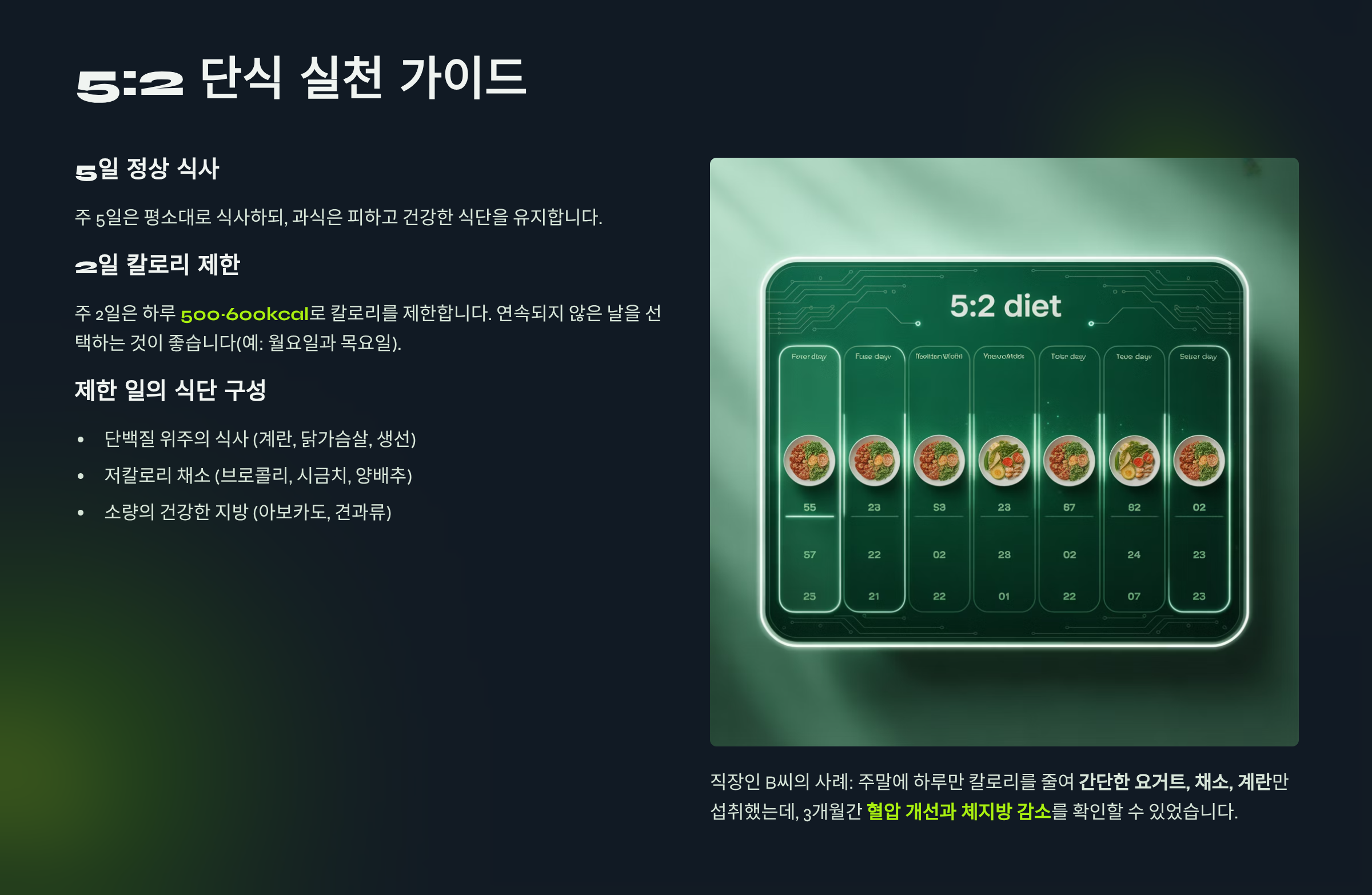 예를 들어 직장인 B 씨는 주말에 하루만 칼로리를 줄여 **간단한 요구르트·채소·계란**만 섭취했는데, 3개월간 **혈압 개선과 체지방 감소**를 확인할 수 있었습니다.