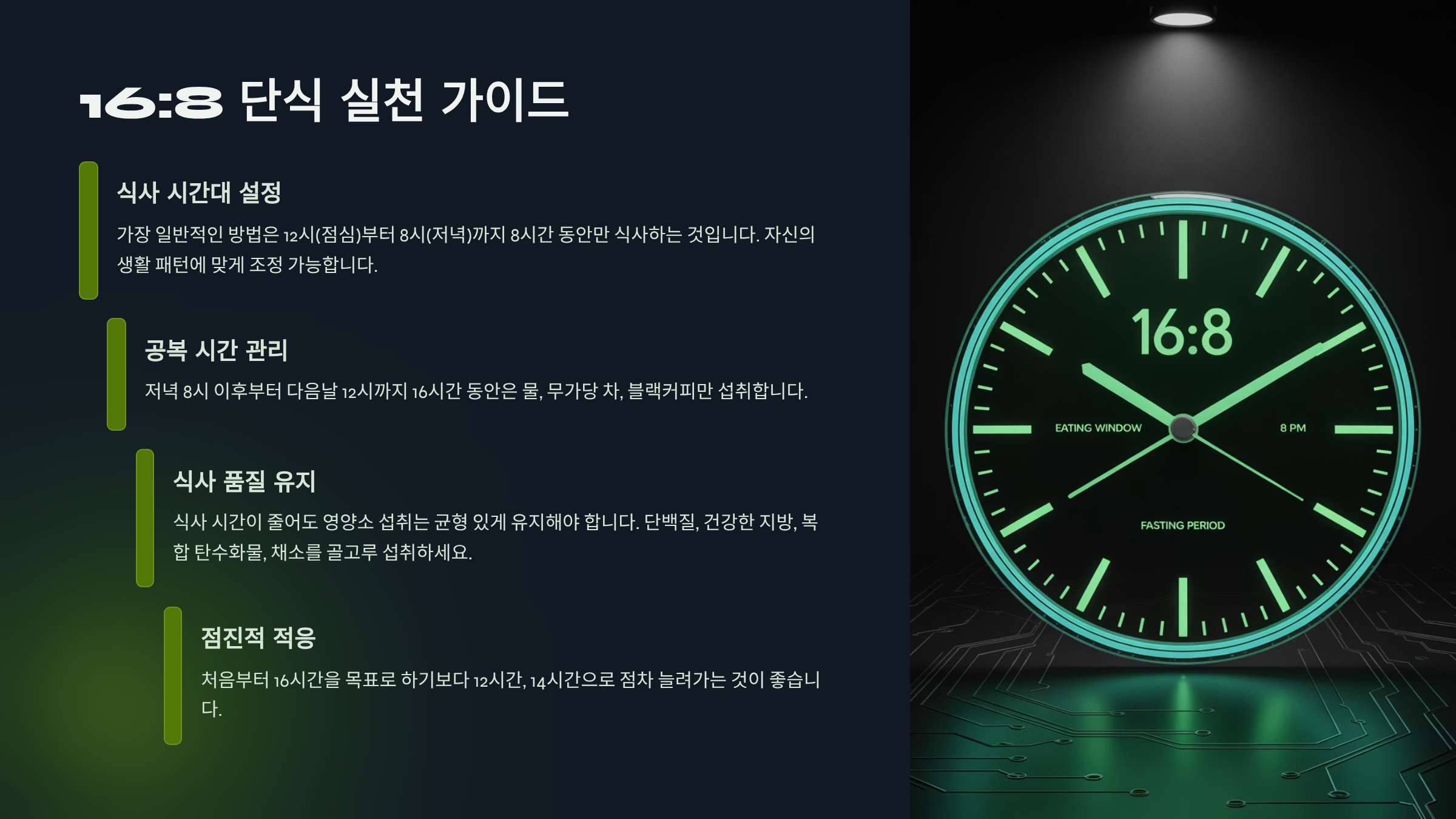 - [ ] 오늘부터 저녁 8시 이후 공복을 유지해 **16:8 패턴**을 시작해 보세요.