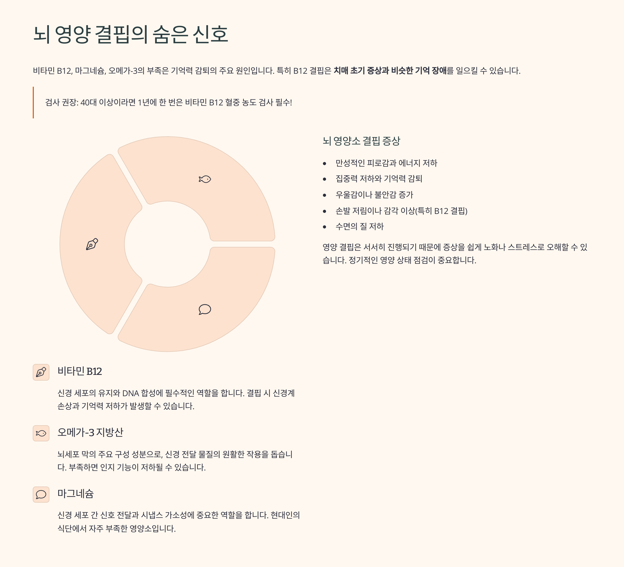 비타민 B12, 마그네슘, 오메가-3의 부족은 기억력 감퇴의 주요 원인입니다. 특히 B12 결핍은 **치매 초기 증상과 비슷한 기억 장애**를 일으킬 수 있습니다.