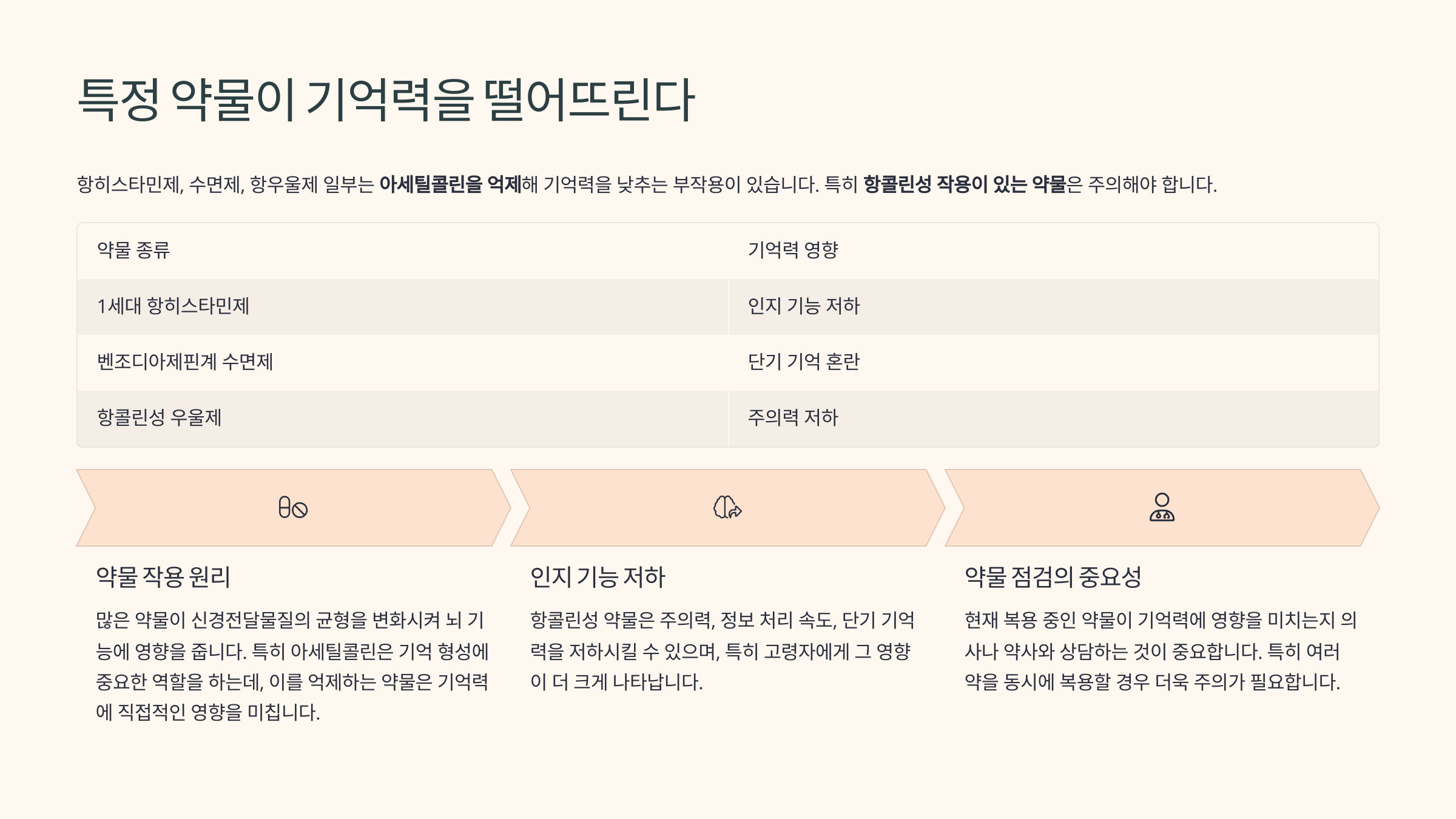 항히스타민제, 수면제, 항우울제 일부는 **아세틸콜린을 억제**해 기억력을 낮추는 부작용이 있습니다. 특히 항콜린성 작용이 있는 약물은 주의해야 합니다.