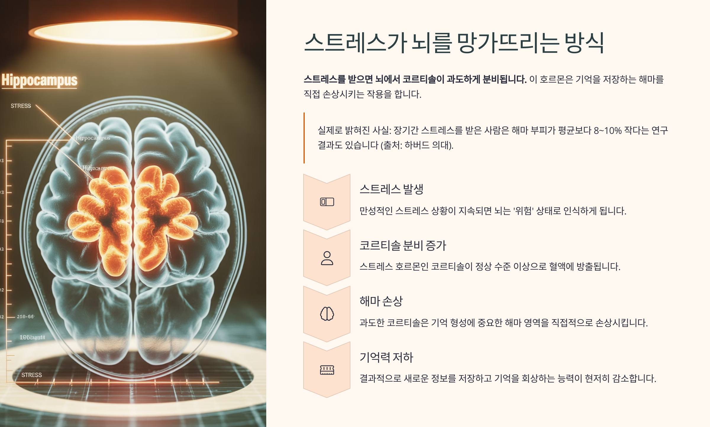 > 실제로 밝혀진 사실: 장기간 스트레스를 받은 사람은 해마 부피가 평균보다 8~10% 작다는 연구 결과도 있습니다 (출처: 하버드 의대).