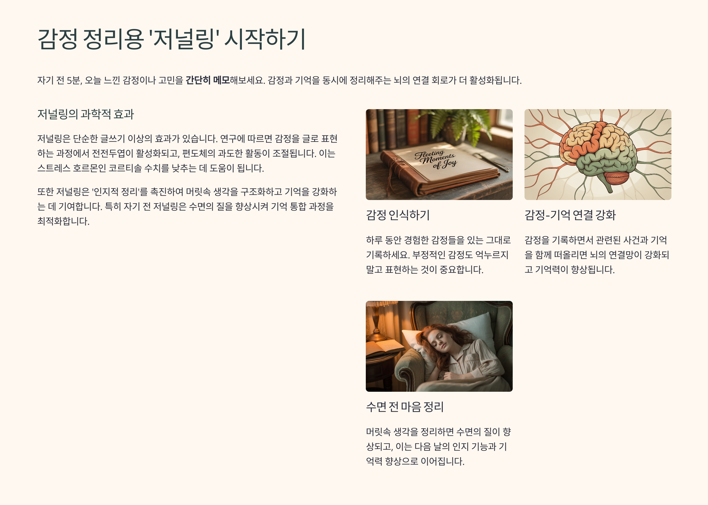 자기 전 5분, 오늘 느낀 감정이나 고민을 **간단히 메모**해보세요. 감정과 기억을 동시에 정리해 주는 뇌의 연결 회로가 더 활성화됩니다.