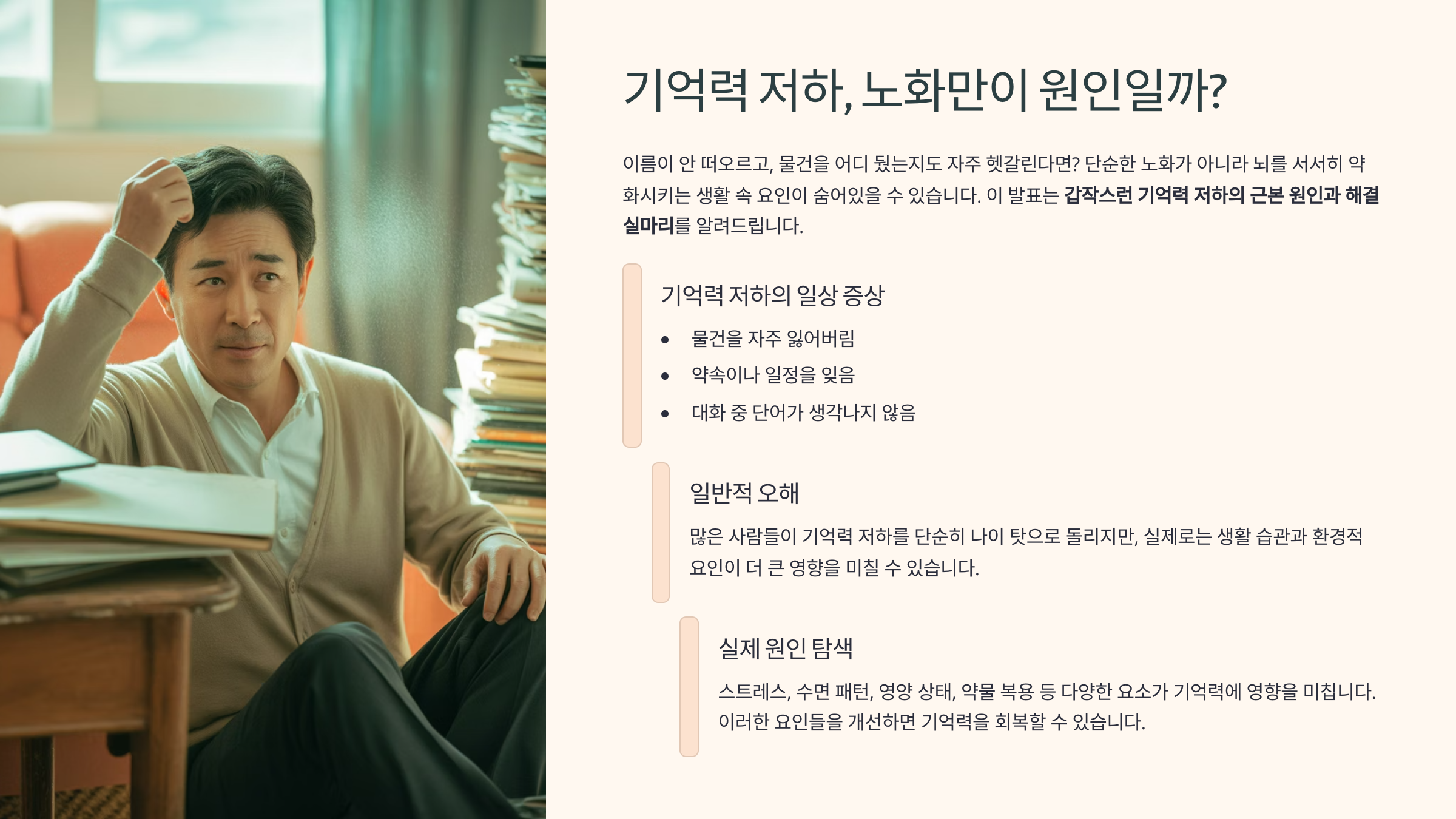 이름이 안 떠오르고, 물건을 어디 뒀는지도 자주 헷갈린다면?** 단순한 노화가 아니라 뇌를 서서히 약화시키는 생활 속 요인이 숨어있을 수 있습니다. 이 글은 **갑작스러운 기억력 저하의 근본 원인과 해결 실마리**를 알려드립니다.