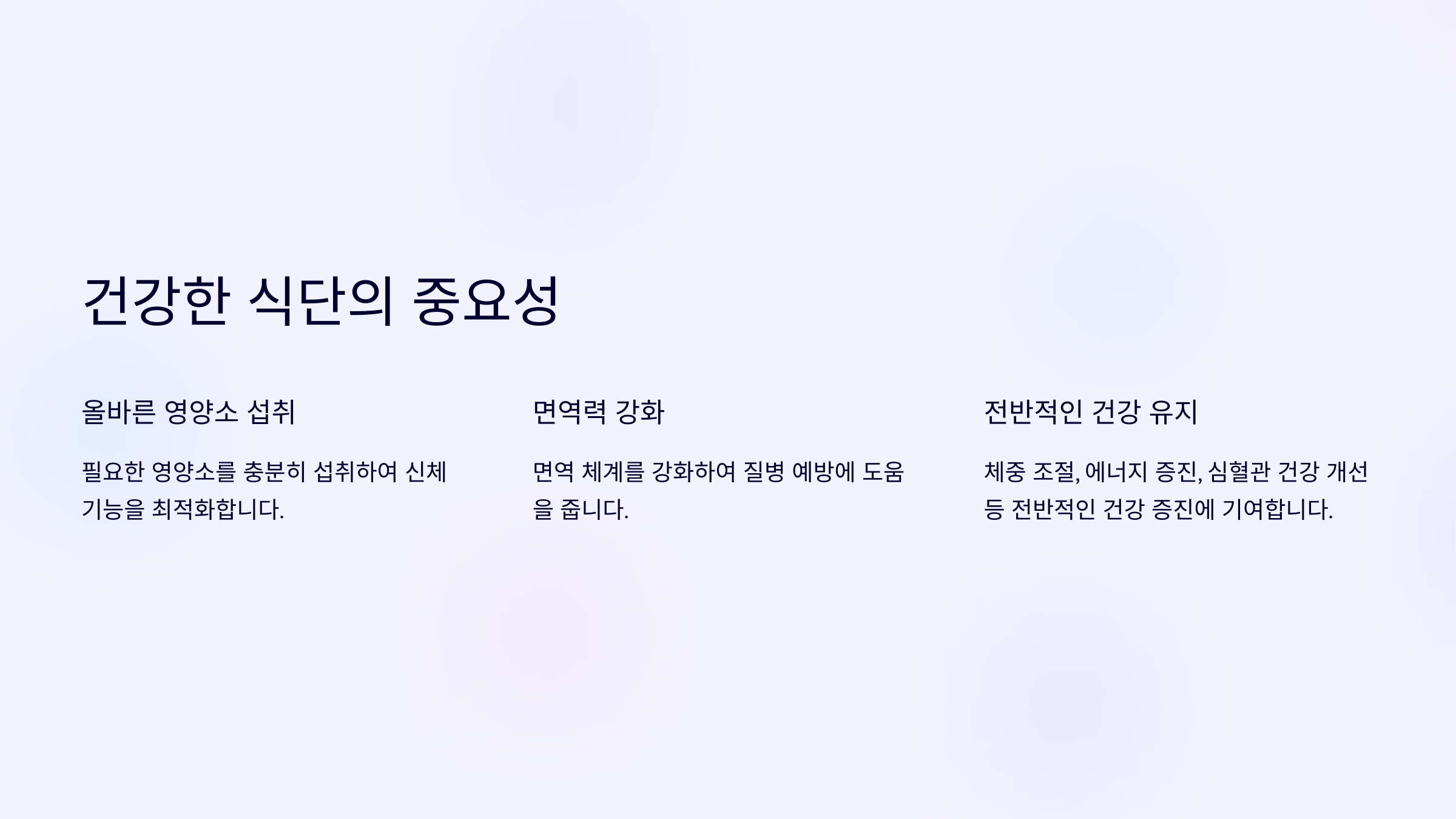 다양한 식품군 포함 : 매일 다양한 식품을 섭취하여 영양소의 균형을 맞추는 것이 중요합니다.