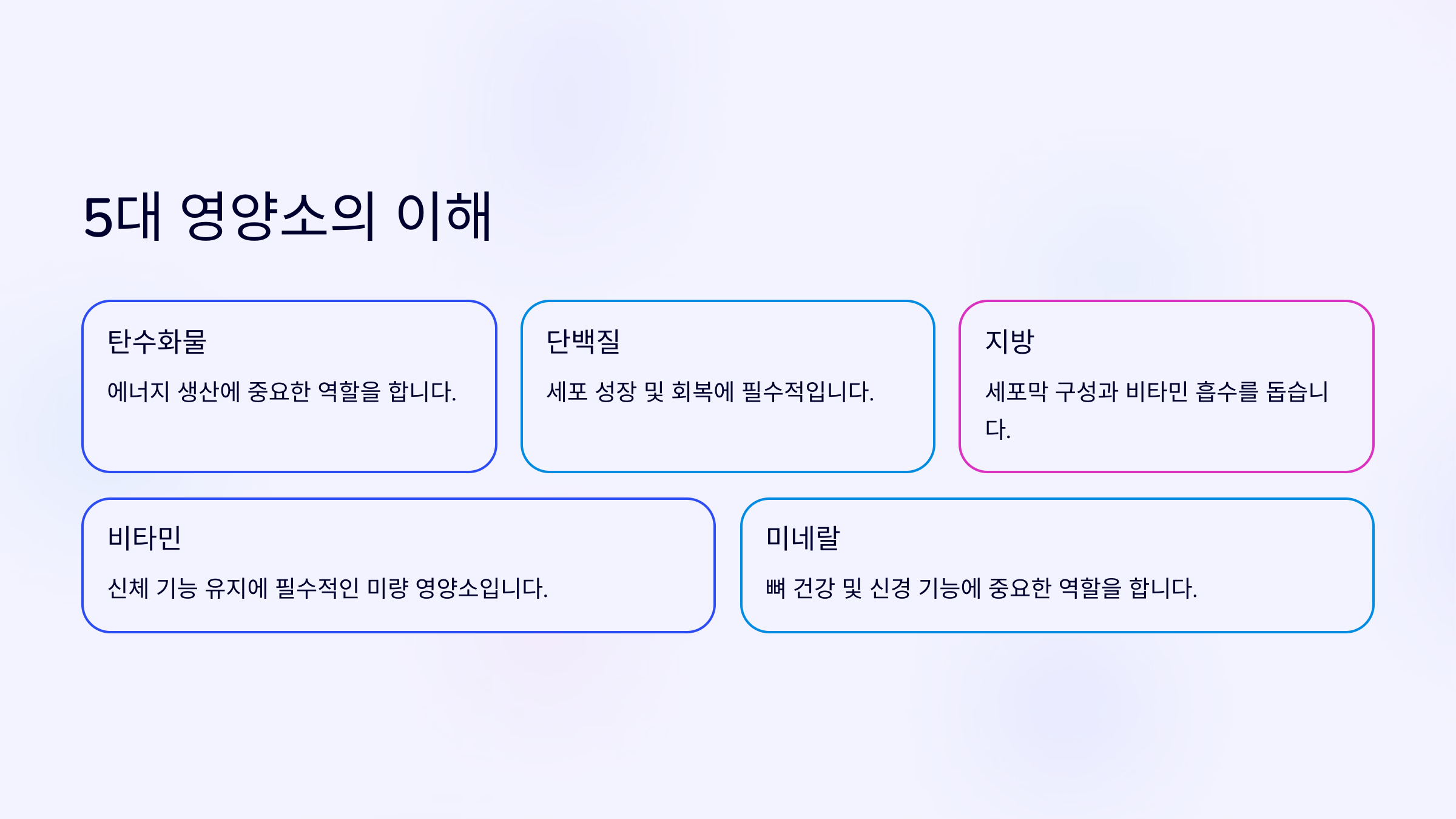 5대 영양소는 탄수화물, 단백질, 지방, 비타민, 미네랄로 구성됩니다. 이들은 각각의 역할이 다르며, 우리 몸이 정상적으로 기능하기 위해서는 이들 영양소가 적절히 섭취되어야 합니다.