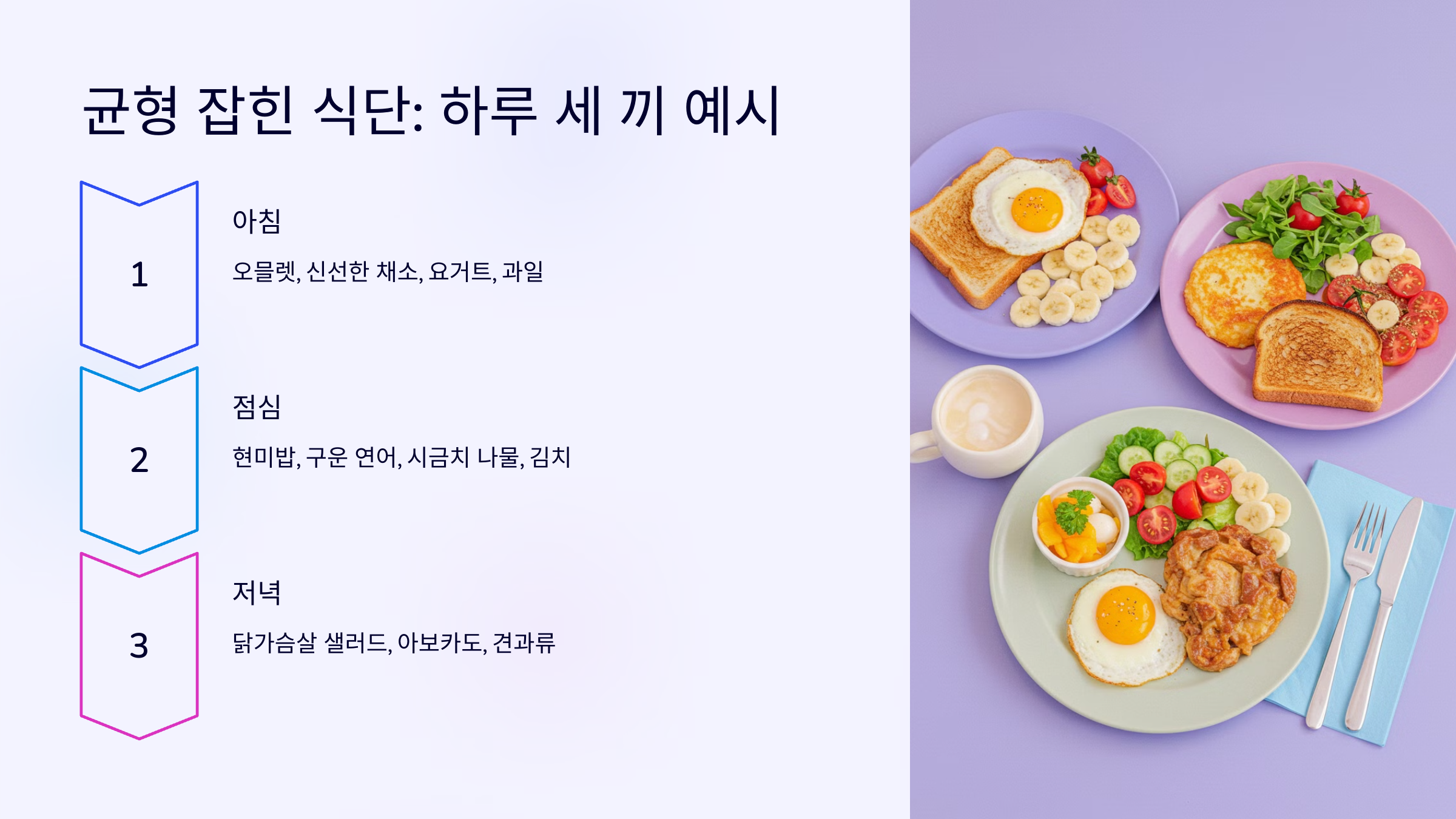 식단을 구성할 때는 다양한 음식을 포함시켜야 합니다. 예를 들어, 하루 세끼를 준비할 때 아래와 같은 균형 잡힌 식사를 고려해 볼 수 있습니다.