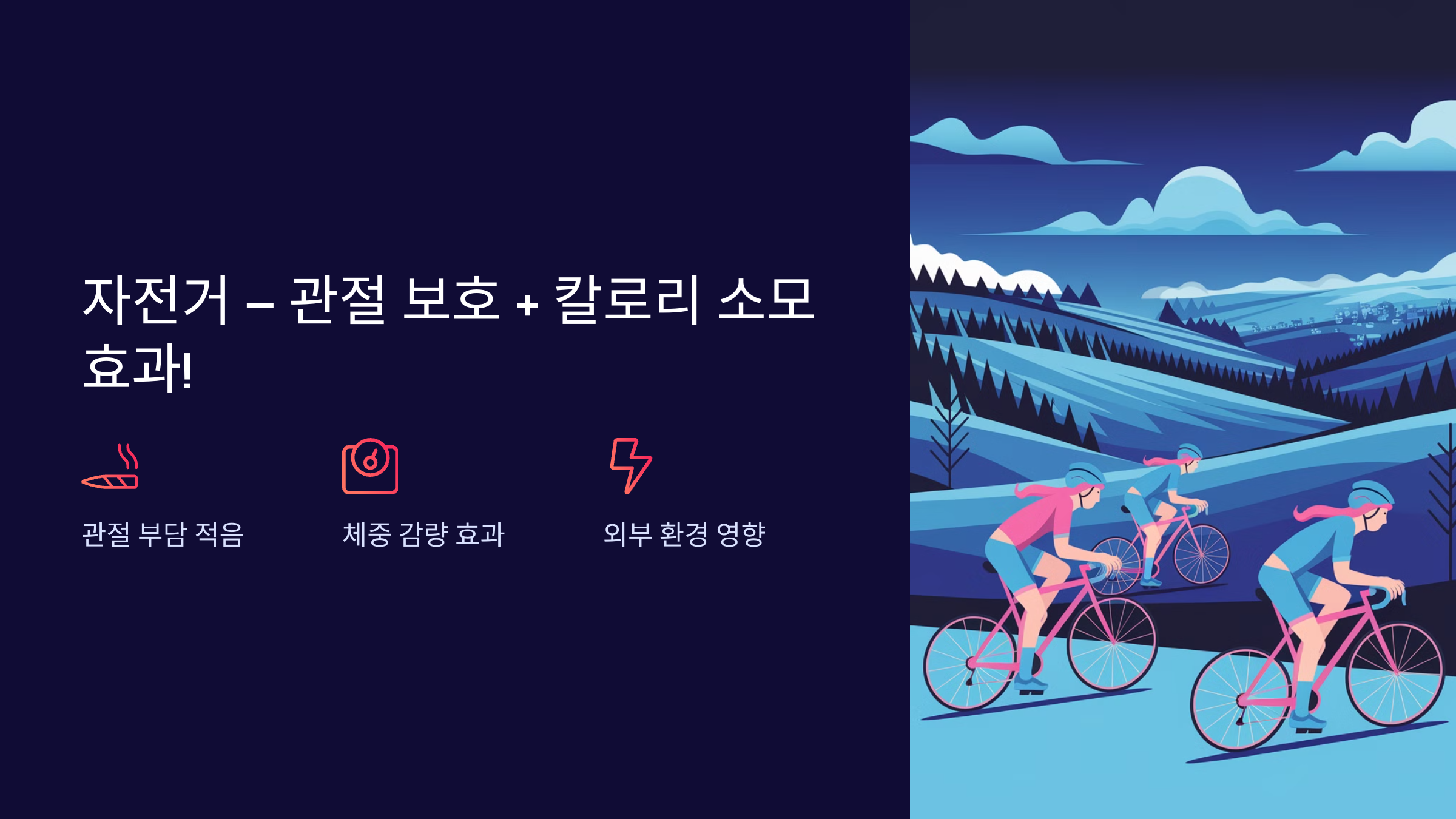 • 장점: 관절 부담이 적고, 체중 감량 효과도 뛰어남