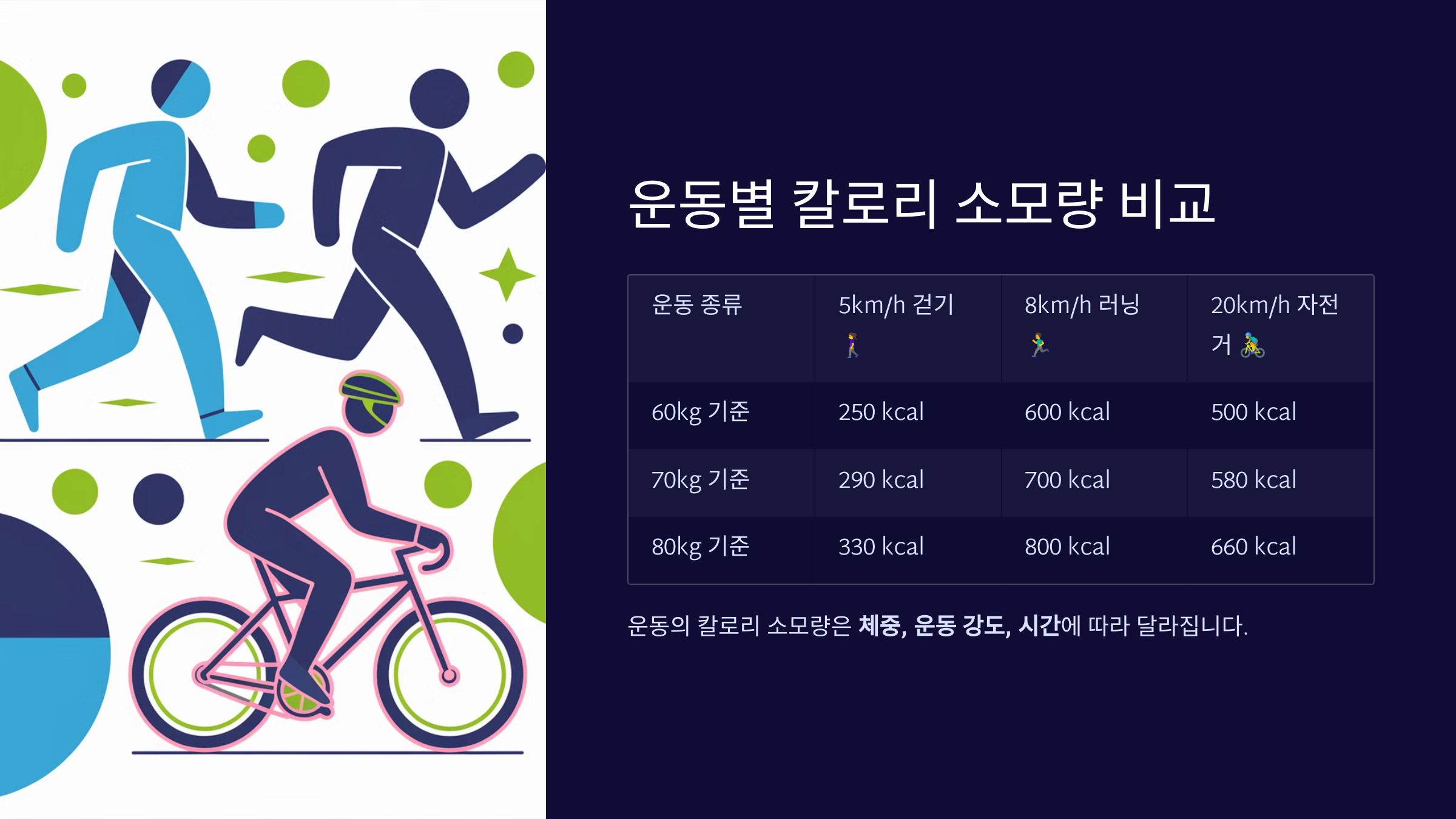 운동 종류 5km/h 걷기 🚶‍♀️ 8km/h 러닝 🏃‍♂️ 20km/h 자전거 🚴‍♂️
