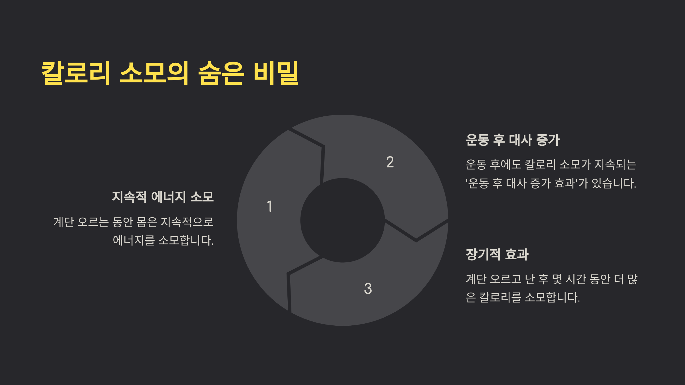 계단 오르기는 단순히 운동하는 것 이상의 효과를 가지고 있습니다. 계단을 오르는 동안 우리의 몸은 지속적으로 에너지를 소모하게 되며, 이는 운동 후에도 계속해서 칼로리를 소모하는 효과를 가져옵니다. 이른바 '운동 후 대사 증가 효과'로, 운동 후에도 칼로리 소모가 지속되는 현상입니다. 예를 들어, 계단을 오르고 난 후에도 몇 시간 동안은 더 많은 칼로리를 소모하게 됩니다.