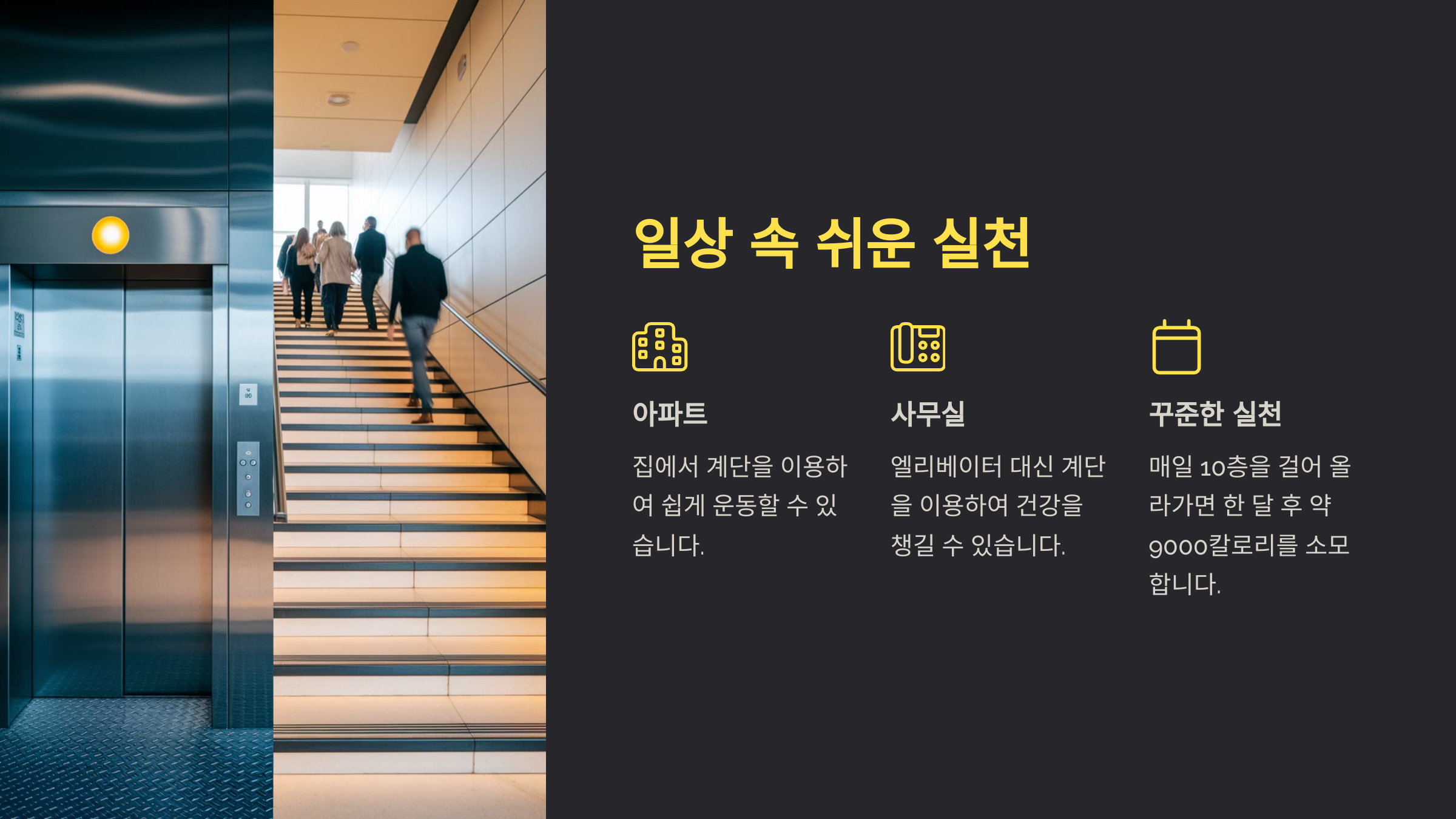 계단 오르기는 특별한 장비나 장소가 필요하지 않습니다. 우리가 사는 아파트나 사무실에서 쉽게 실천할 수 있는 운동입니다. 엘리베이터 대신 계단을 이용하는 것만으로도 건강을 챙길 수 있습니다. 예를 들어, 매일 10층을 걸어 올라가면 한 달 후에는 약 9000칼로리를 소모하게 됩니다. 이는 체중 감량에 큰 도움이 될 수 있습니다.