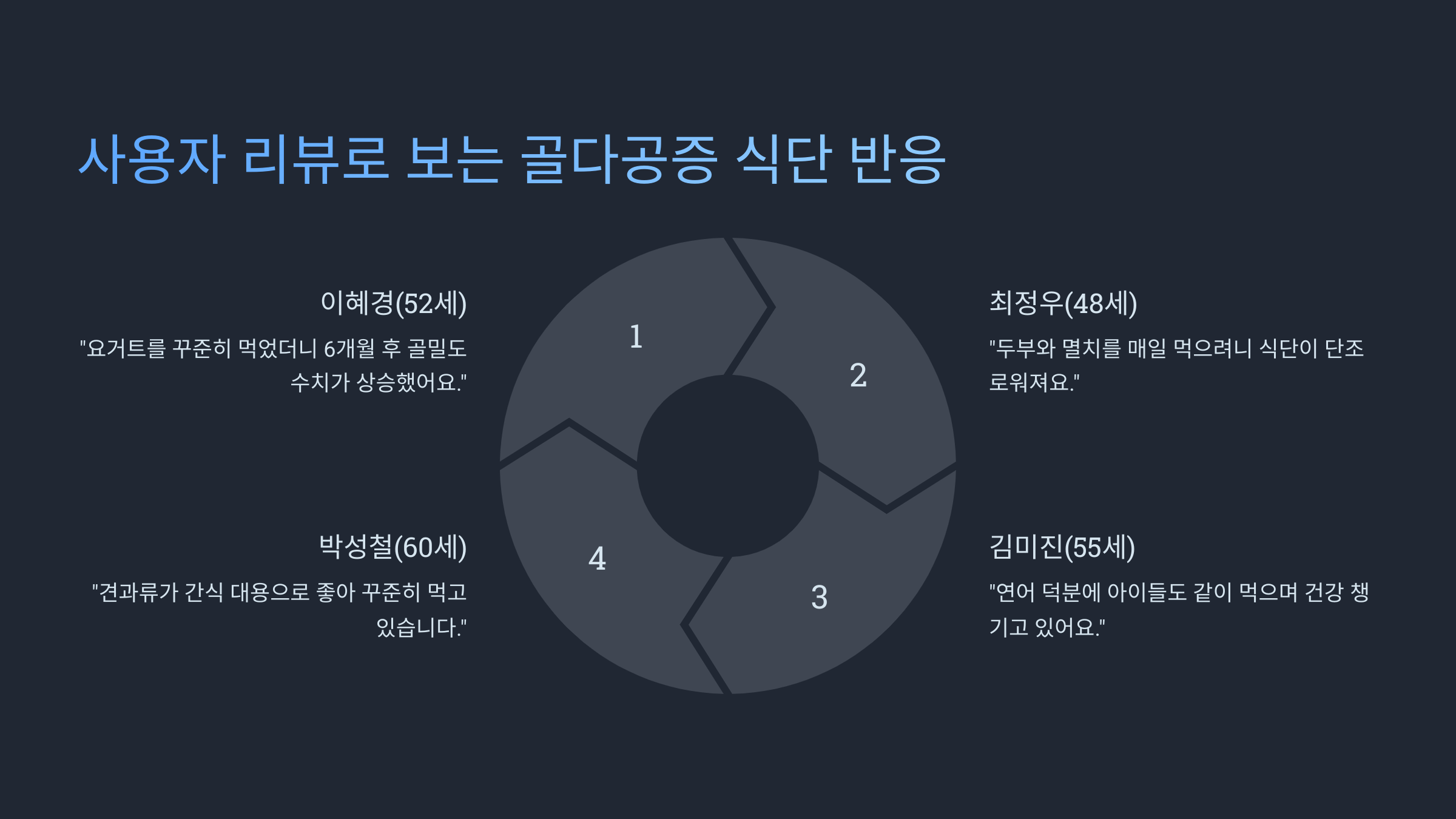 - 이혜경(52세): “요거트를 꾸준히 먹었더니 6개월 후 골밀도 수치가 상승했어요.”