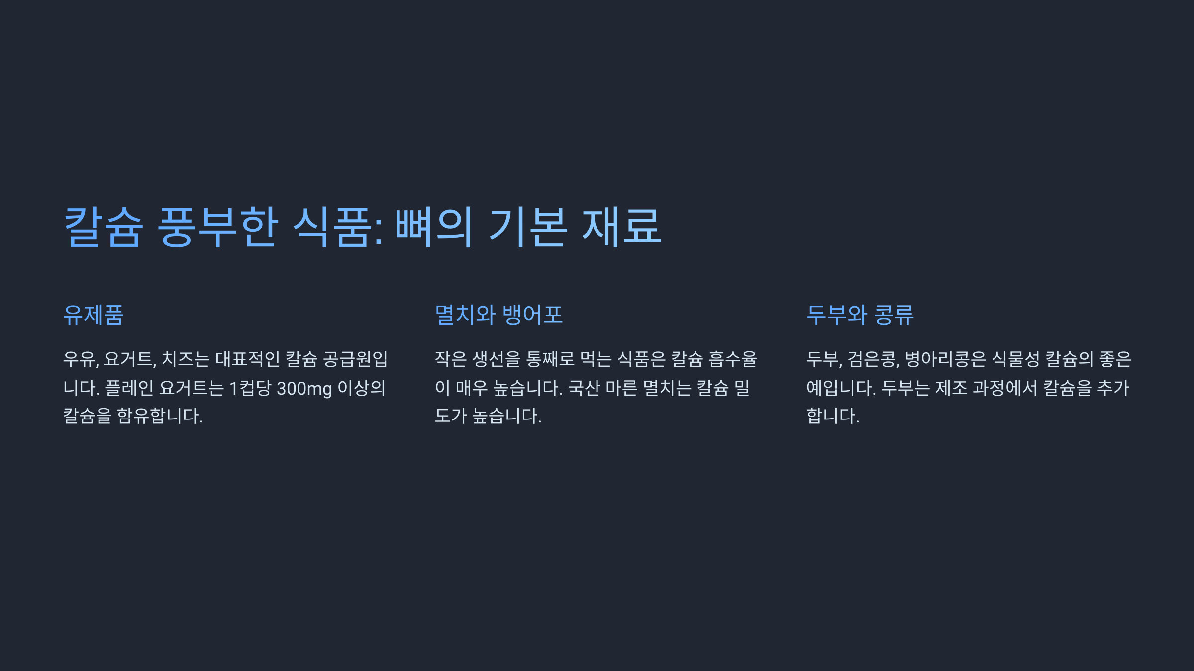 우유, 요구르트, 치즈는 대표적인 칼슘 공급원입니다. 특히 플레인 요구르트에는 1컵당 300mg 이상의 칼슘이 포함되어 있어 매일 아침 한 컵으로 뼈 건강을 챙길 수 있습니다.