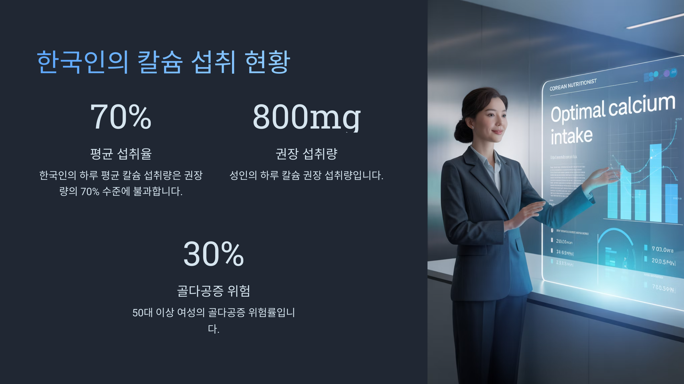대한영양사협회 자료에 따르면, 한국인의 하루 평균 칼슘 섭취량은 권장량의 70% 수준에 불과합니다.