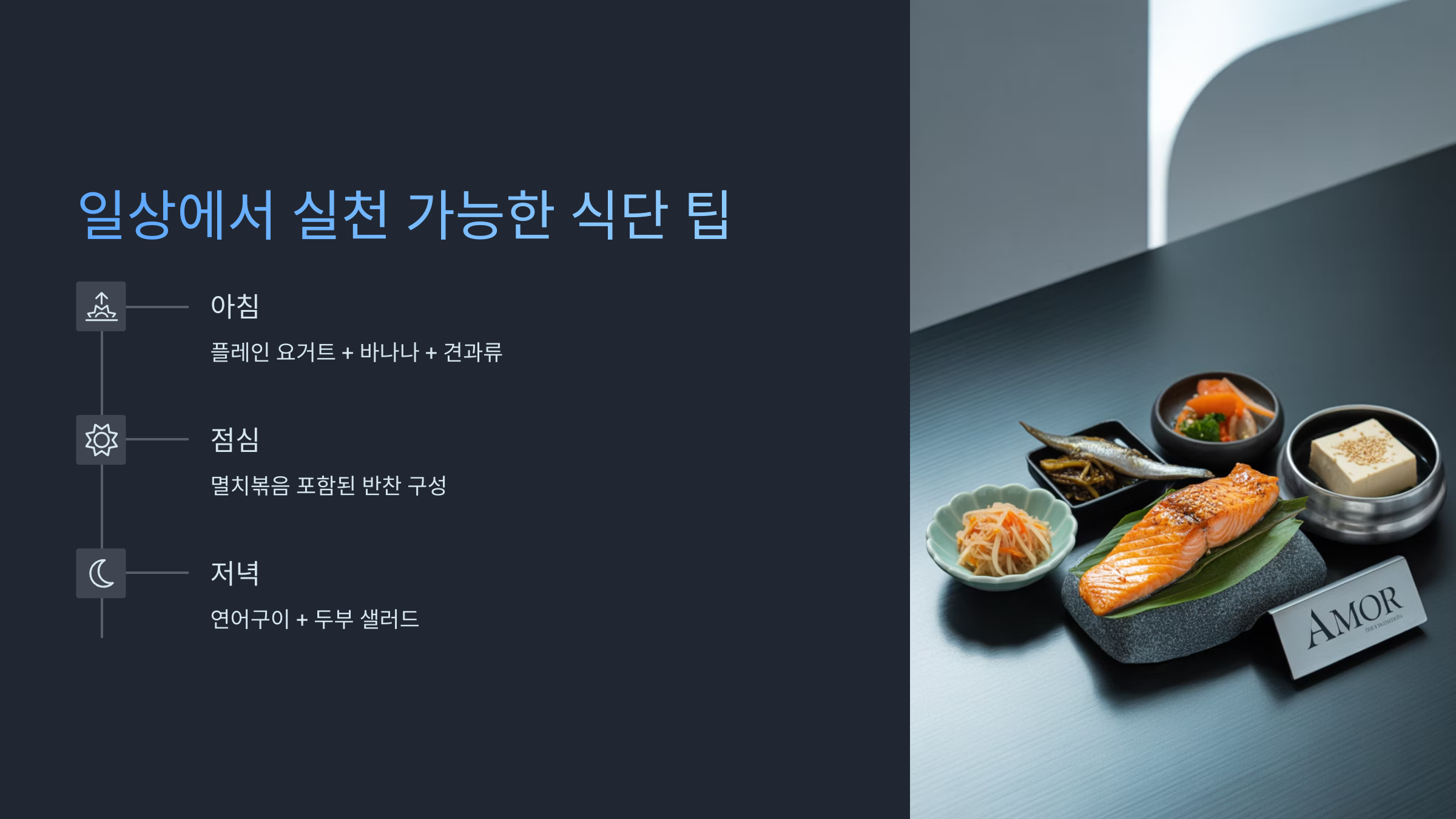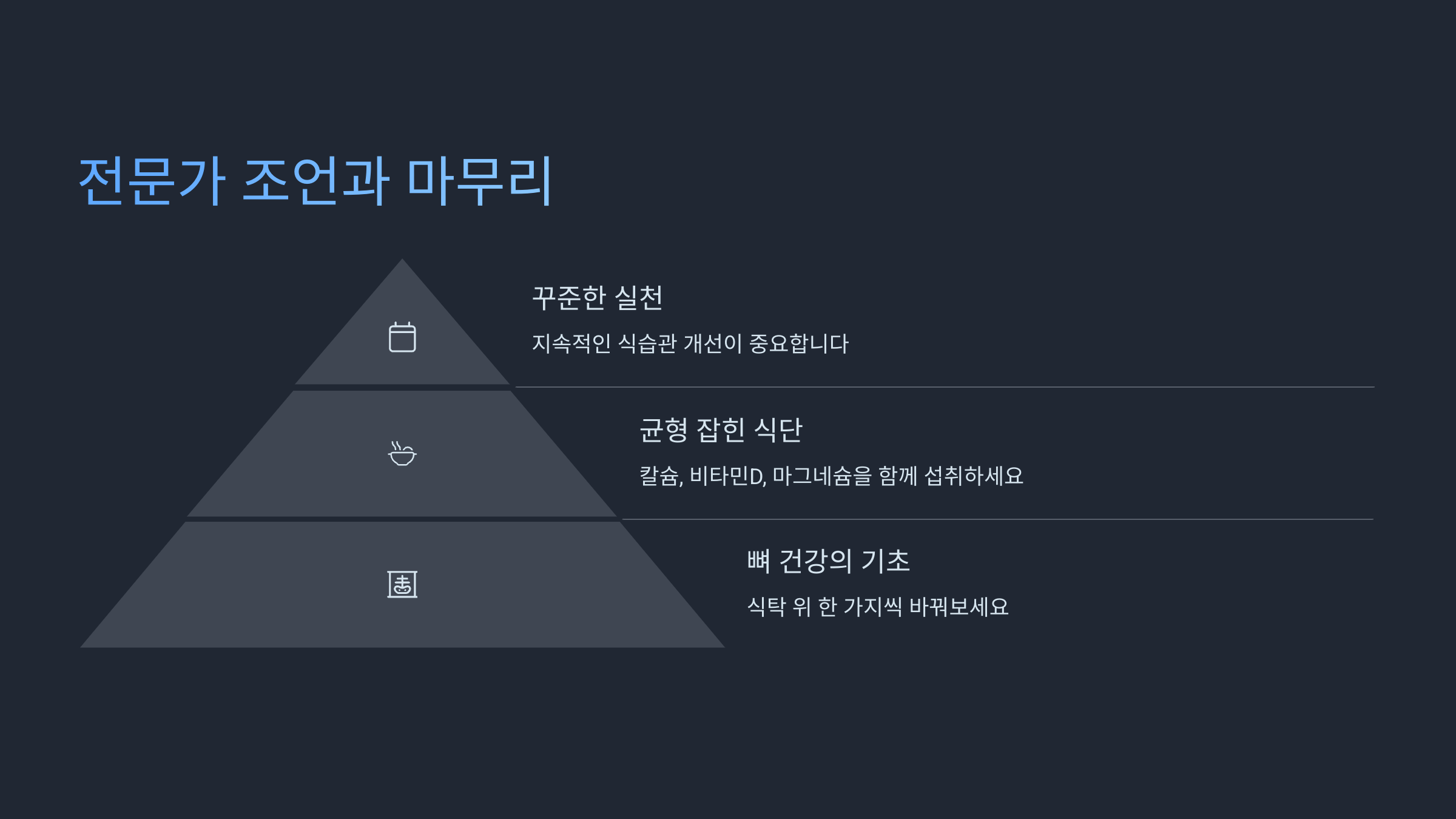 식단을 통해 충분한 칼슘, 비타민D, 마그네슘을 섭취하는 것이 뼈 건강의 첫걸음입니다. 지금부터라도 식탁 위 한 가지씩 바꿔보는 것이, 향후 골절과 통증을 줄이는 확실한 예방책이 될 수 있습니다.