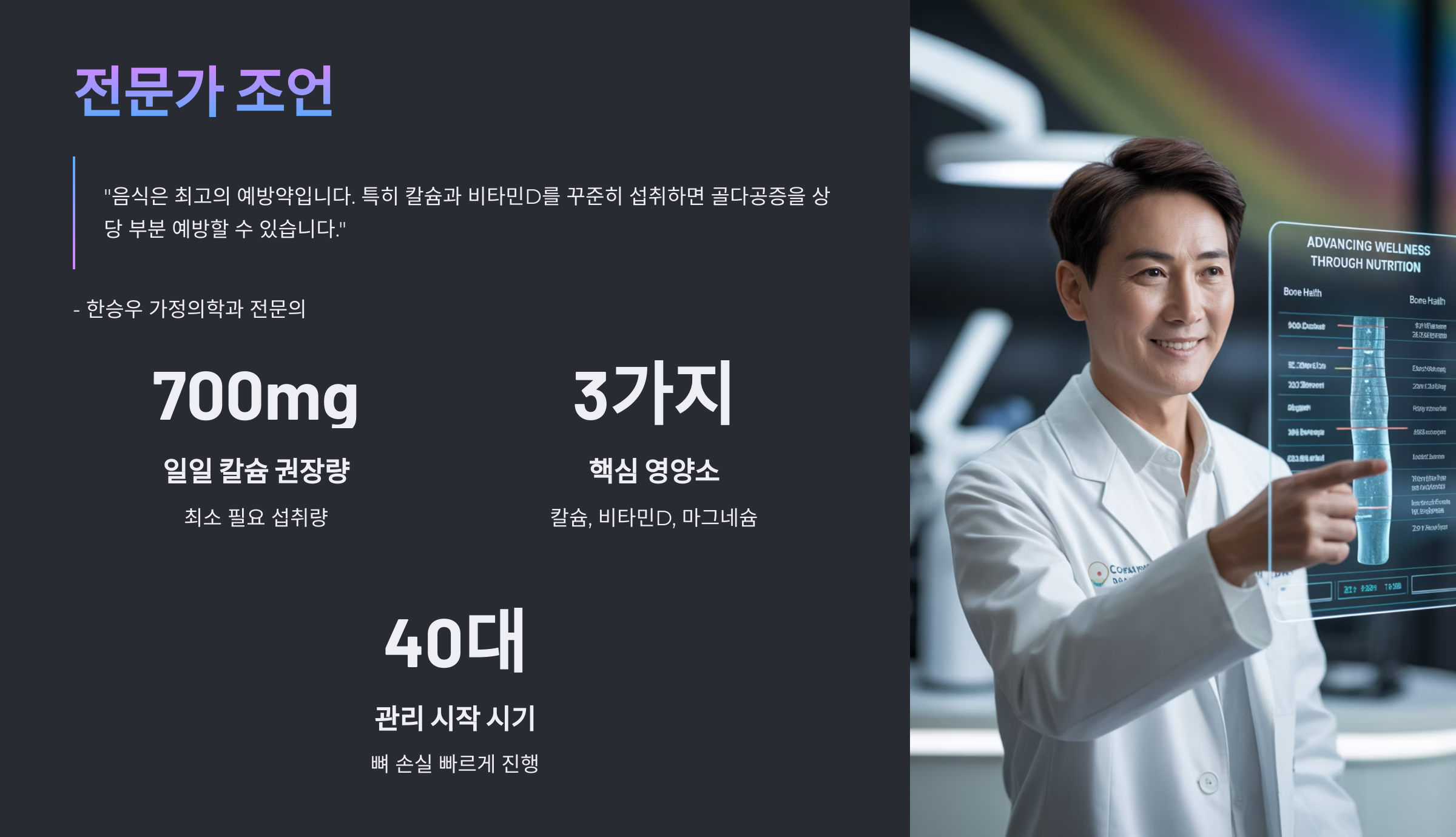 “음식은 최고의 예방약입니다. 특히 칼슘과 비타민D를 꾸준히 섭취하면 골다공증을 상당 부분 예방할 수 있습니다.” – 한승우 가정의학과 전문의