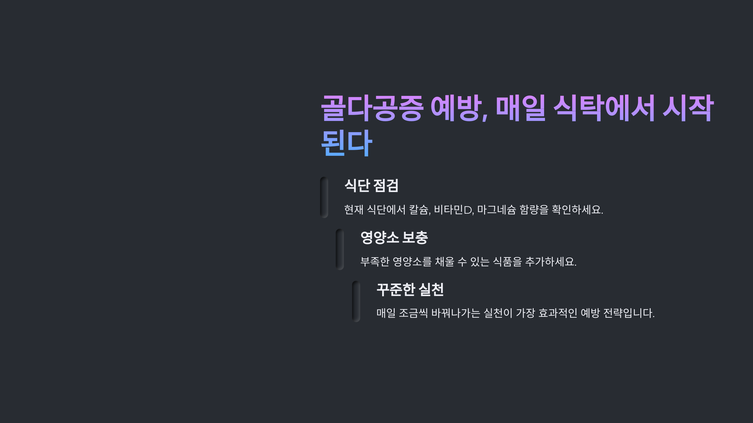 골다공증은 단번에 해결되는 문제가 아닙니다. 매일 먹는 음식에서 조금씩 바꿔나가는 실천이야말로 가장 효과적인 예방 전략입니다. 오늘 저녁, 칼슘과 비타민D가 풍부한 식단으로 내일의 뼈 건강을 지켜보세요.