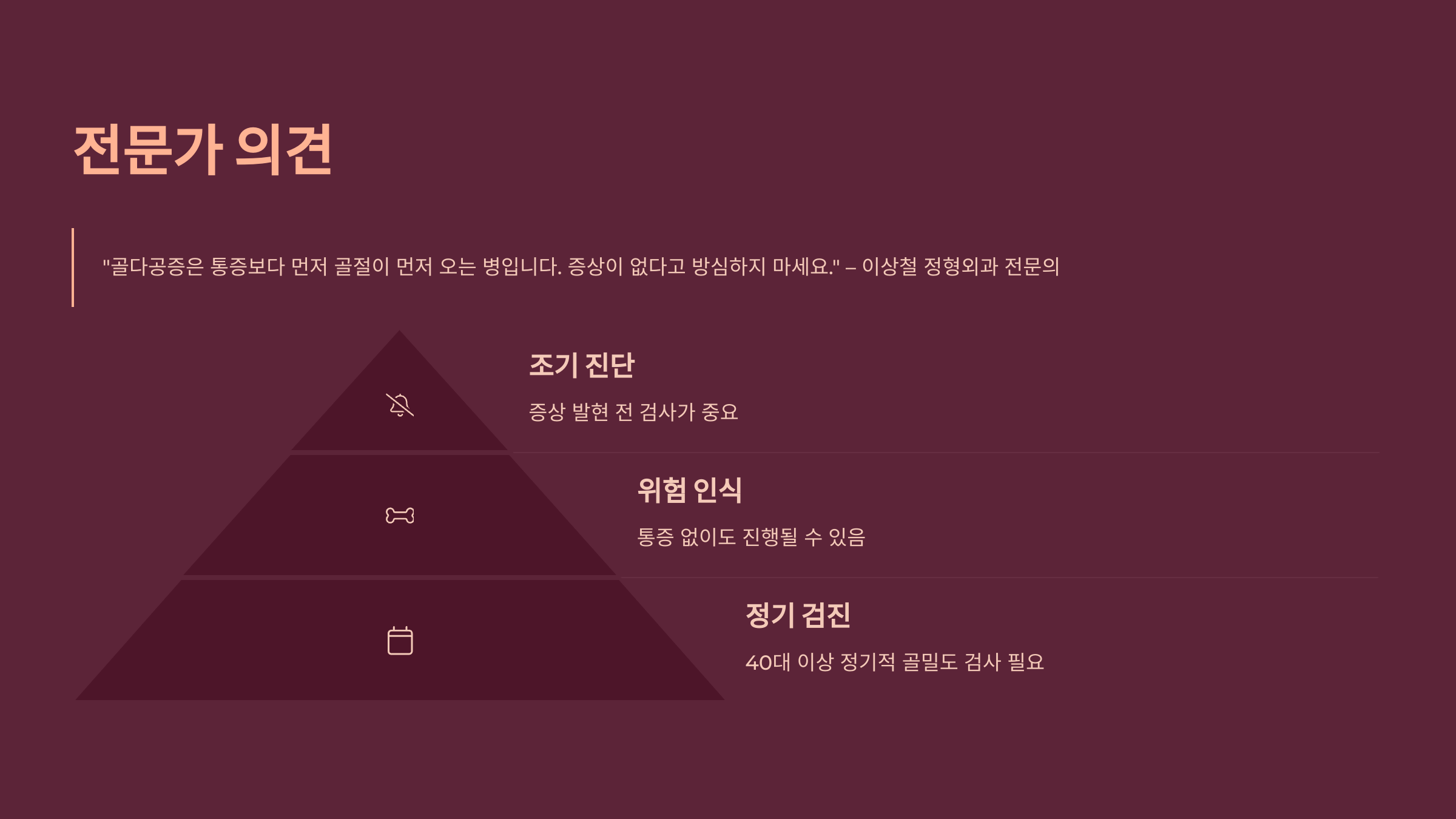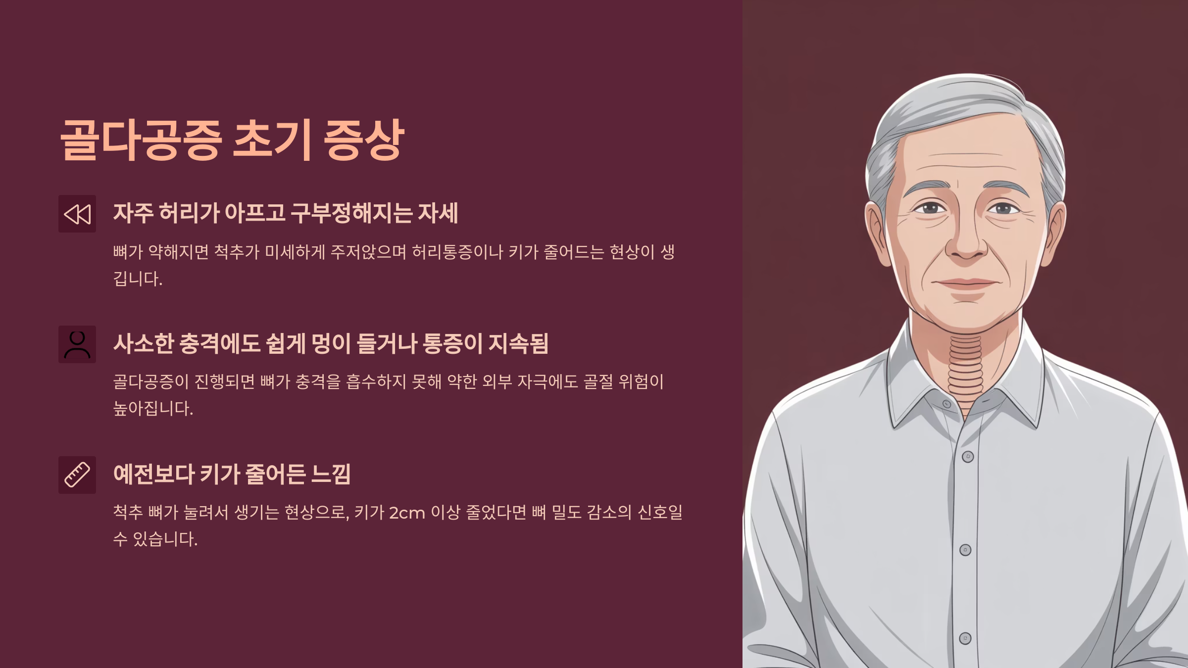 골다공증은 조용한 도둑처럼 다가옵니다. 눈에 띄는 통증 없이 진행되기 때문에 40대 이상 직장인이라면 증상이 생기기 전부터 관심을 가져야 합니다. 일상 속에서 간과하기 쉬운 작은 징후들이 뼈 건강의 적신호일 수 있습니다.
