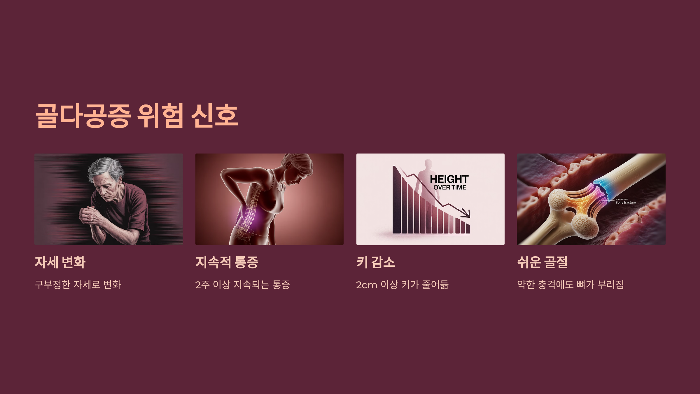 골다공증은 조용한 도둑처럼 다가옵니다. 눈에 띄는 통증 없이 진행되기 때문에 40대 이상 직장인이라면 증상이 생기기 전부터 관심을 가져야 합니다. 일상 속에서 간과하기 쉬운 작은 징후들이 뼈 건강의 적신호일 수 있습니다.
