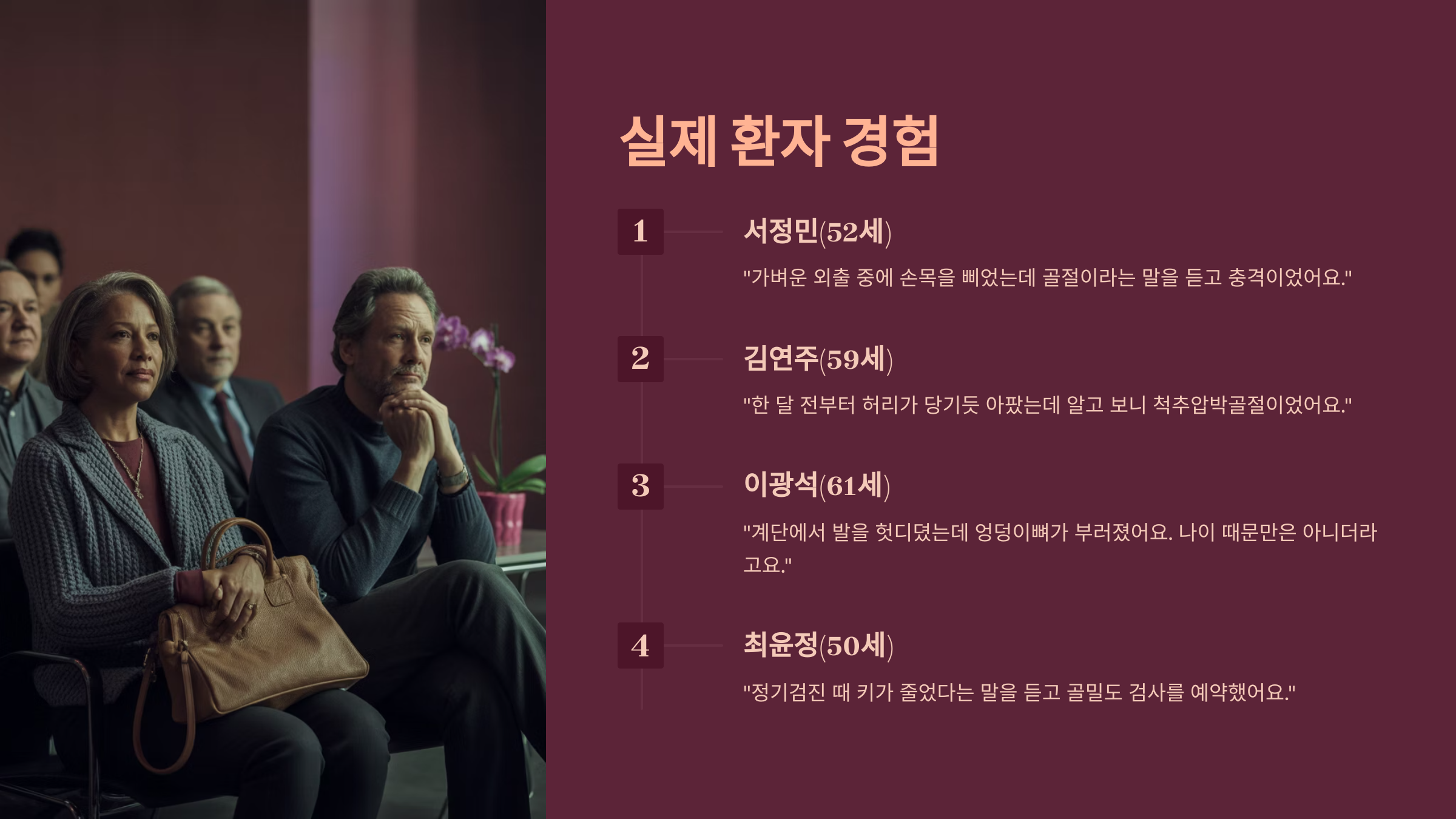 - 서정민(52세): “가벼운 외출 중에 손목을 삐었는데 골절이라는 말을 듣고 충격이었어요.”