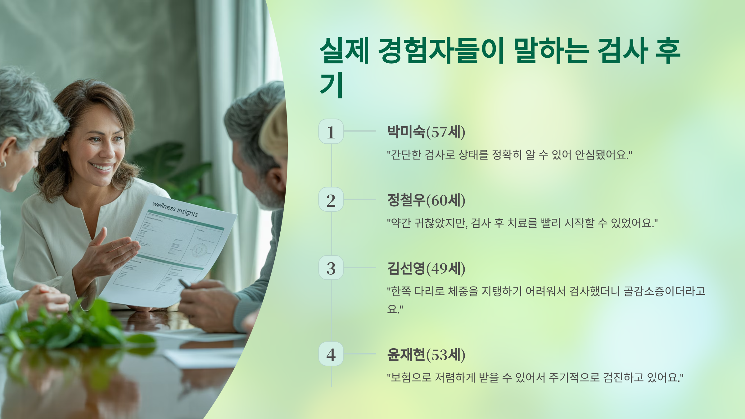 • 윤재현(53세): “보험으로 저렴하게 받을 수 있어서 주기적으로 검진하고 있어요.”