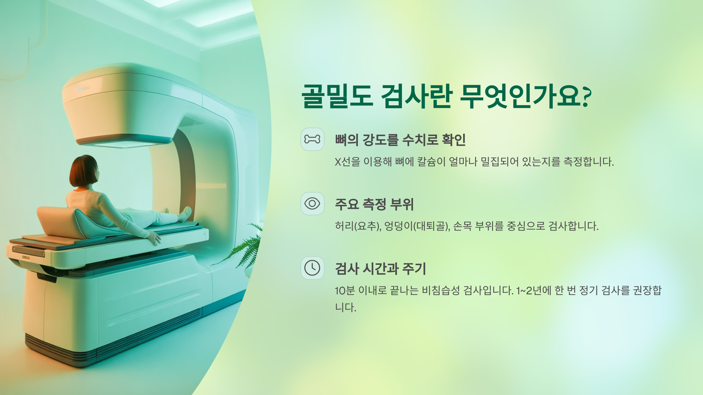 40대 이후 뼈 건강에 대한 경고음이 울리기 시작합니다. 특히 조용히 진행되는 골다공증은 자각 증상 없이 골절로 이어질 수 있어 더욱 위험하죠. 골밀도 검사는 그 위험을 조기에 감지하고 예방할 수 있는 핵심 도구입니다.