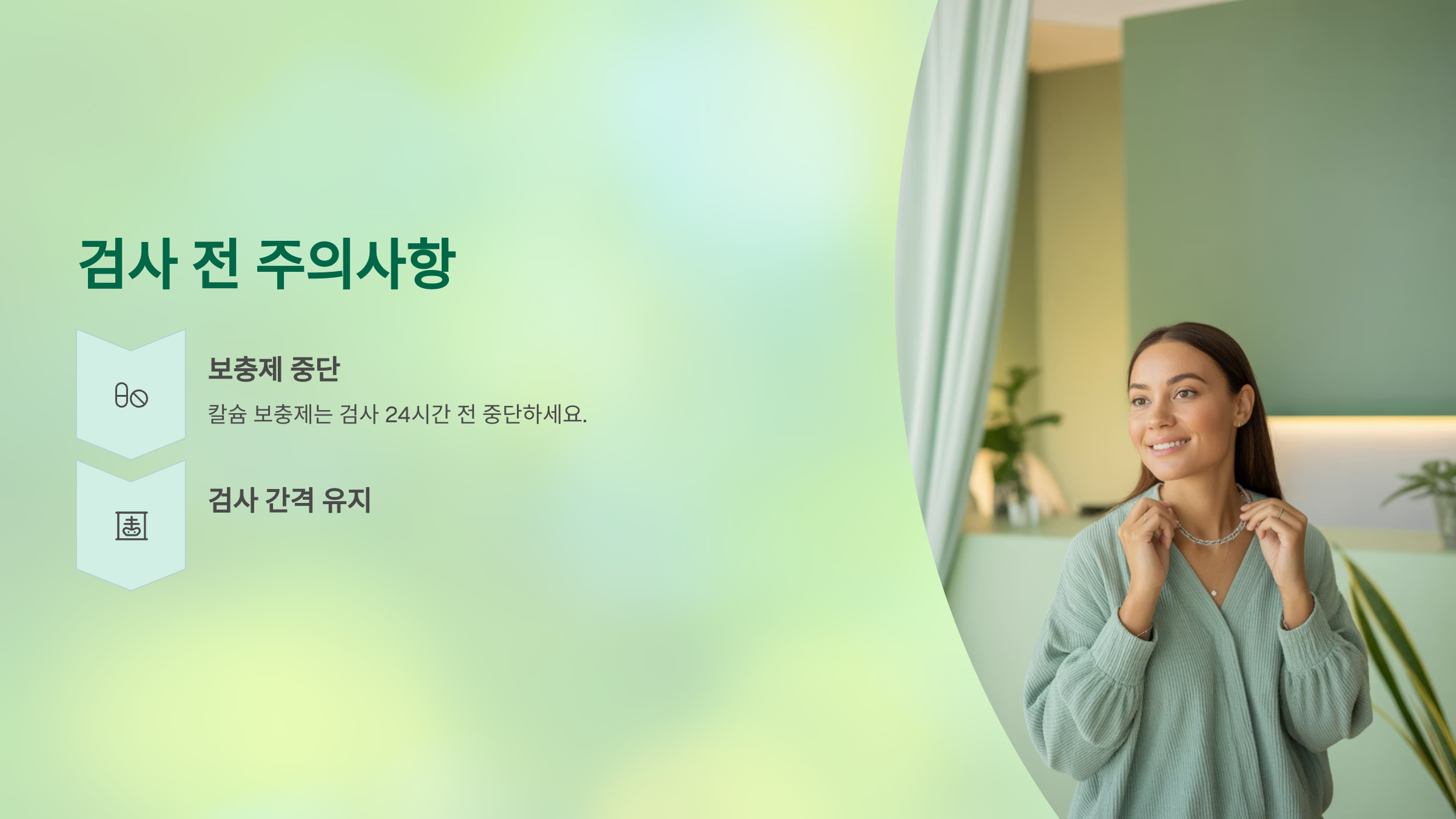 10분 이내로 끝나는 비침습성 검사로, 통증이나 회복 시간이 필요 없습니다. 40대 이상이거나 폐경기 여성, 골다공증 가족력이 있는 경우 1~2년에 한 번 정기 검사를 권장합니다.