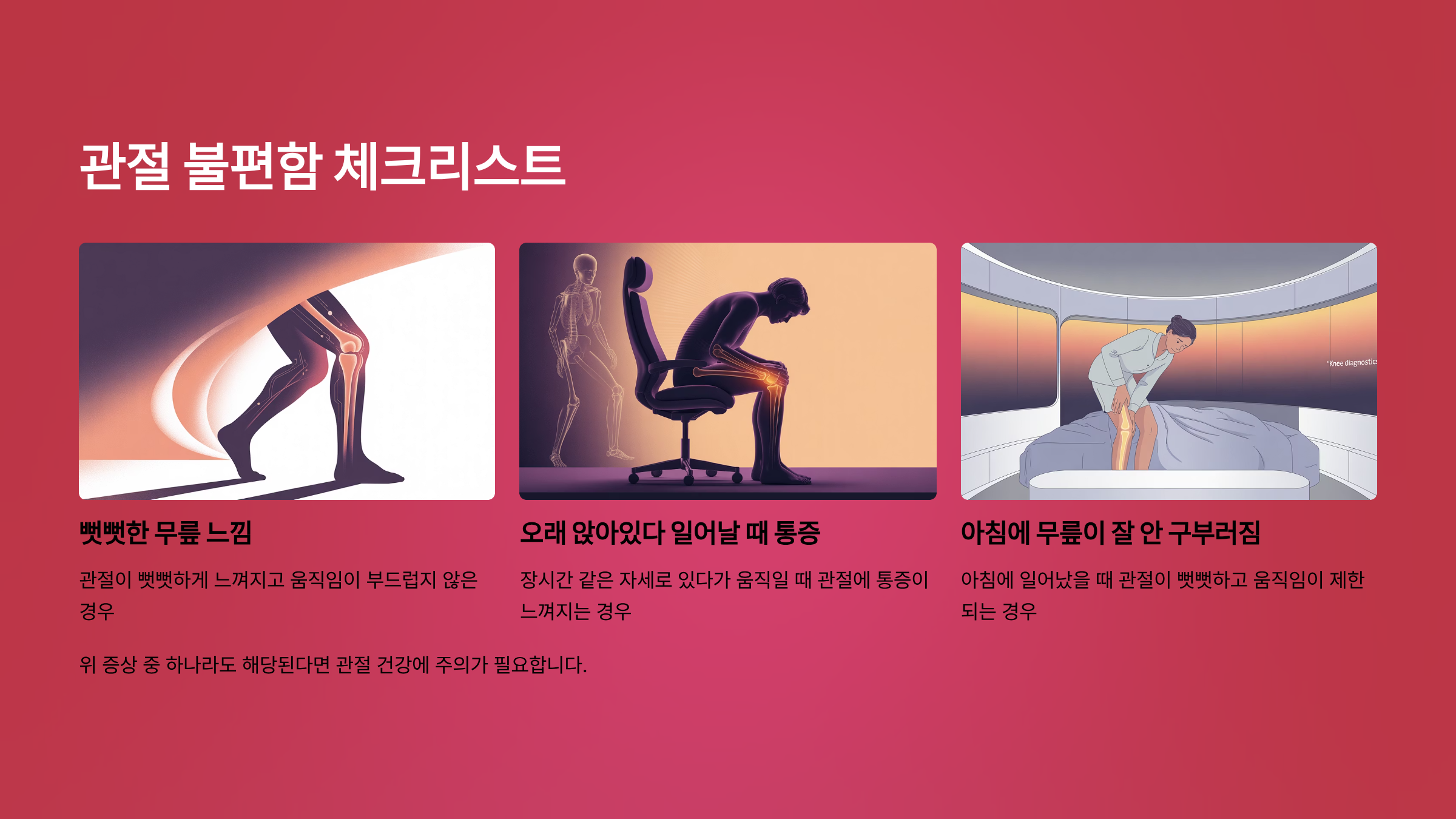 > 체크리스트: - [x] 뻣뻣한 무릎 느낌 있다 - [x] 오래 앉아 있다 일어나면 통증 - [ ] 아침에 무릎이 잘 안 구부러진다