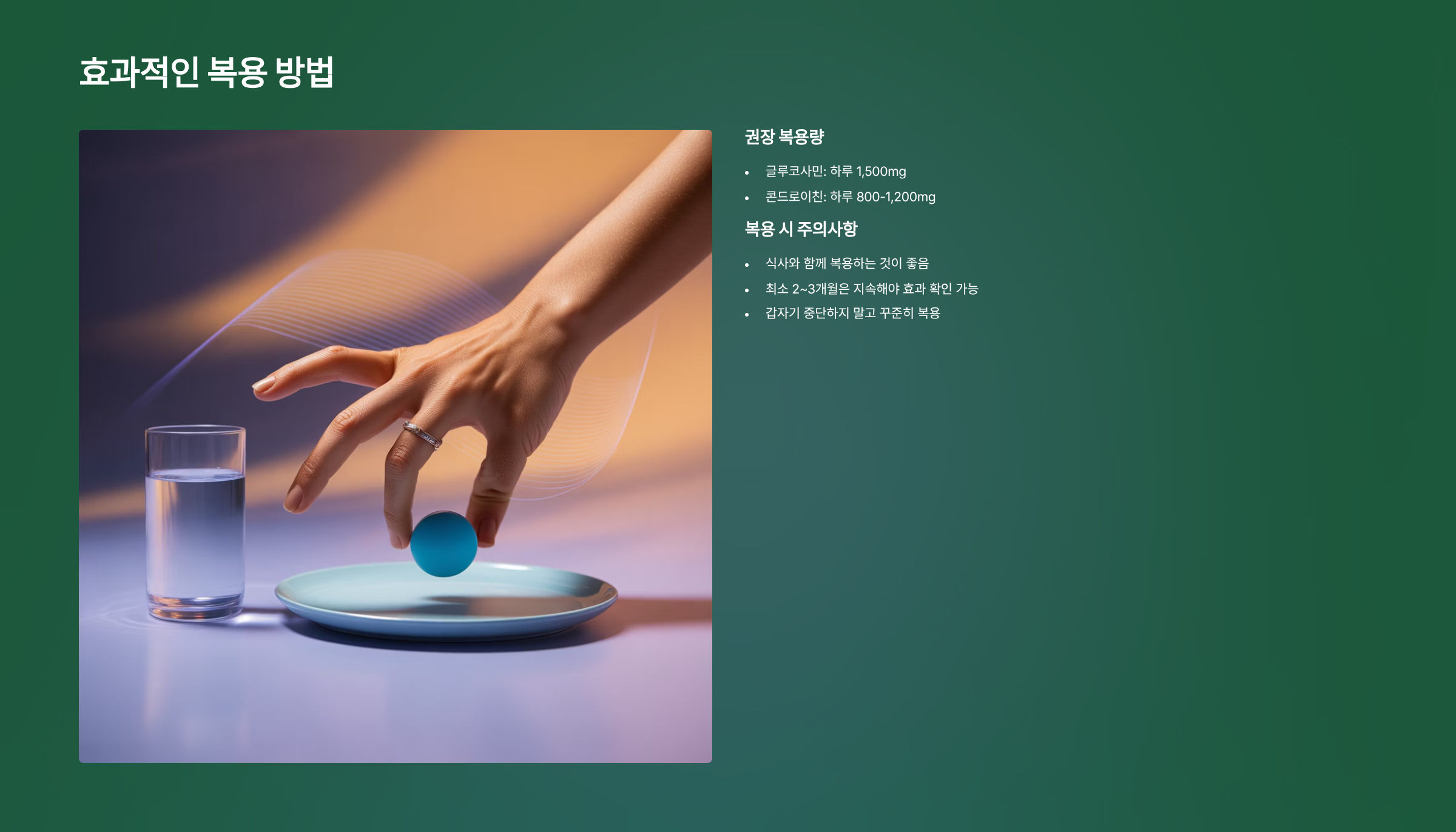 3단계: 식사와 함께 하루 1,500mg 복용이 일반적이며, 최소 2~3개월은 지속해야 효과 여부를 판단할 수 있습니다.