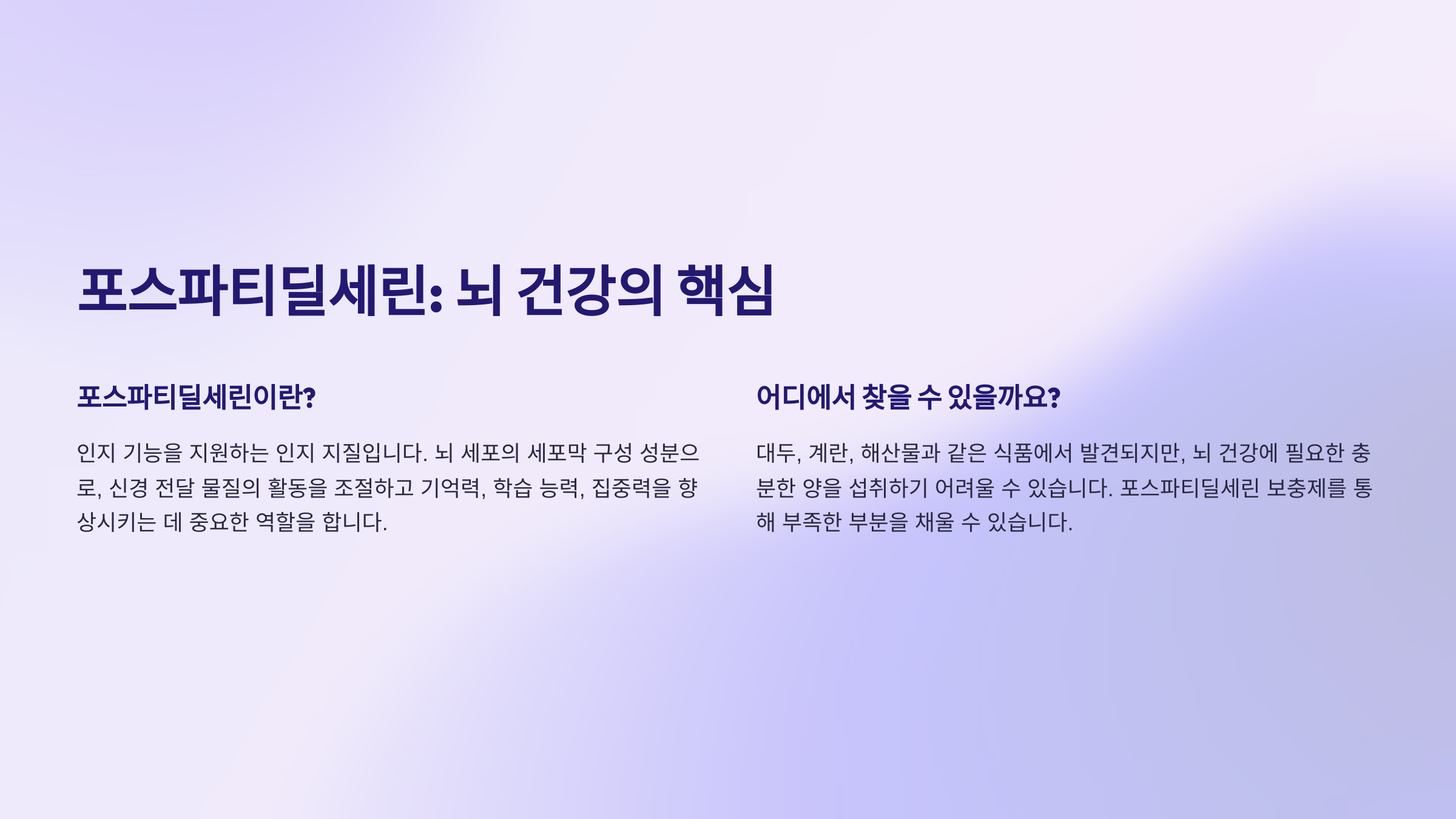 포스파티딜세린은 인지 기능을 지원하는 중요한 인지 지질입니다. 뇌 세포의 세포막을 구성하는 주요 성분으로, 신경전달물질의 기능을 돕고 세포 간의 신호 전달을 원활하게 합니다. 이는 마치 뇌의 '소통 네트워크'를 강화하는 역할을 합니다.