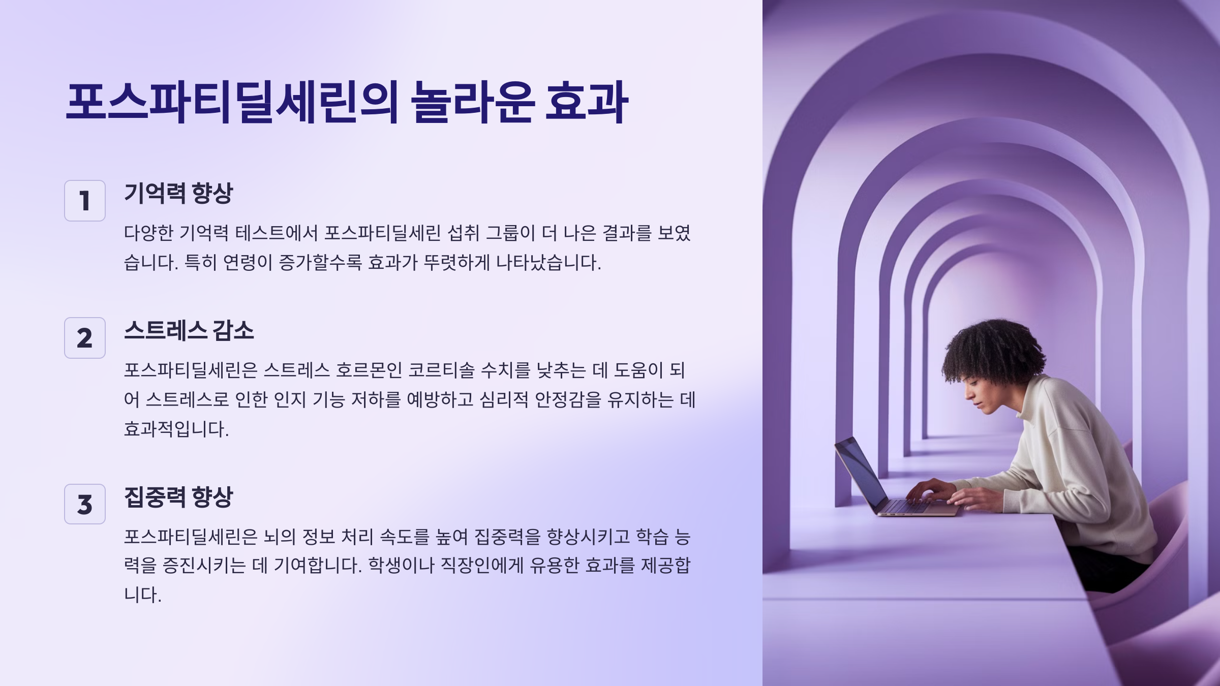 포스파티딜세린은 기억력 향상에 도움을 줍니다. 연구에 따르면, 이 영양소를 섭취한 사람들은 기억력 테스트에서 더 나은 성과를 보였습니다. 이는 마치 뇌의 '기억 저장소'가 더 넓어지는 것과 같습니다. 예를 들어, 학생들이 시험 준비를 할 때 포스파티딜세린을 섭취하면 더 효과적으로 정보를 기억할 수 있습니다.