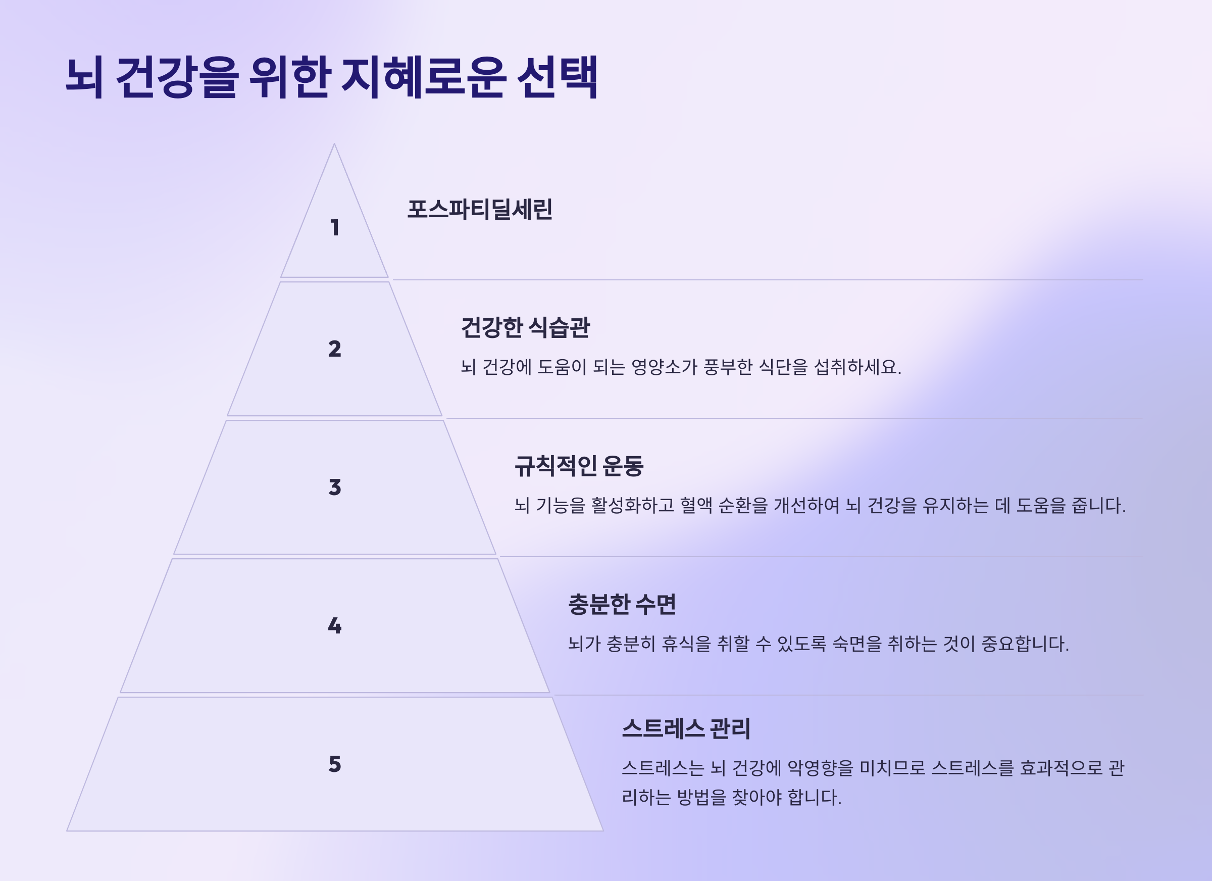 뇌 건강을 지키기 위해서는 예방이 중요합니다. 포스파티딜세린을 포함한 건강한 식단과 생활습관을 유지하는 것이 뇌 기능 저하를 막는 데 큰 도움이 됩니다. 이는 마치 뇌를 위한 '방어막'을 만드는 것과 같습니다. 예를 들어, 규칙적인 운동과 함께 포스파티딜세린을 섭취하면 뇌 건강을 더욱 강화할 수 있습니다.