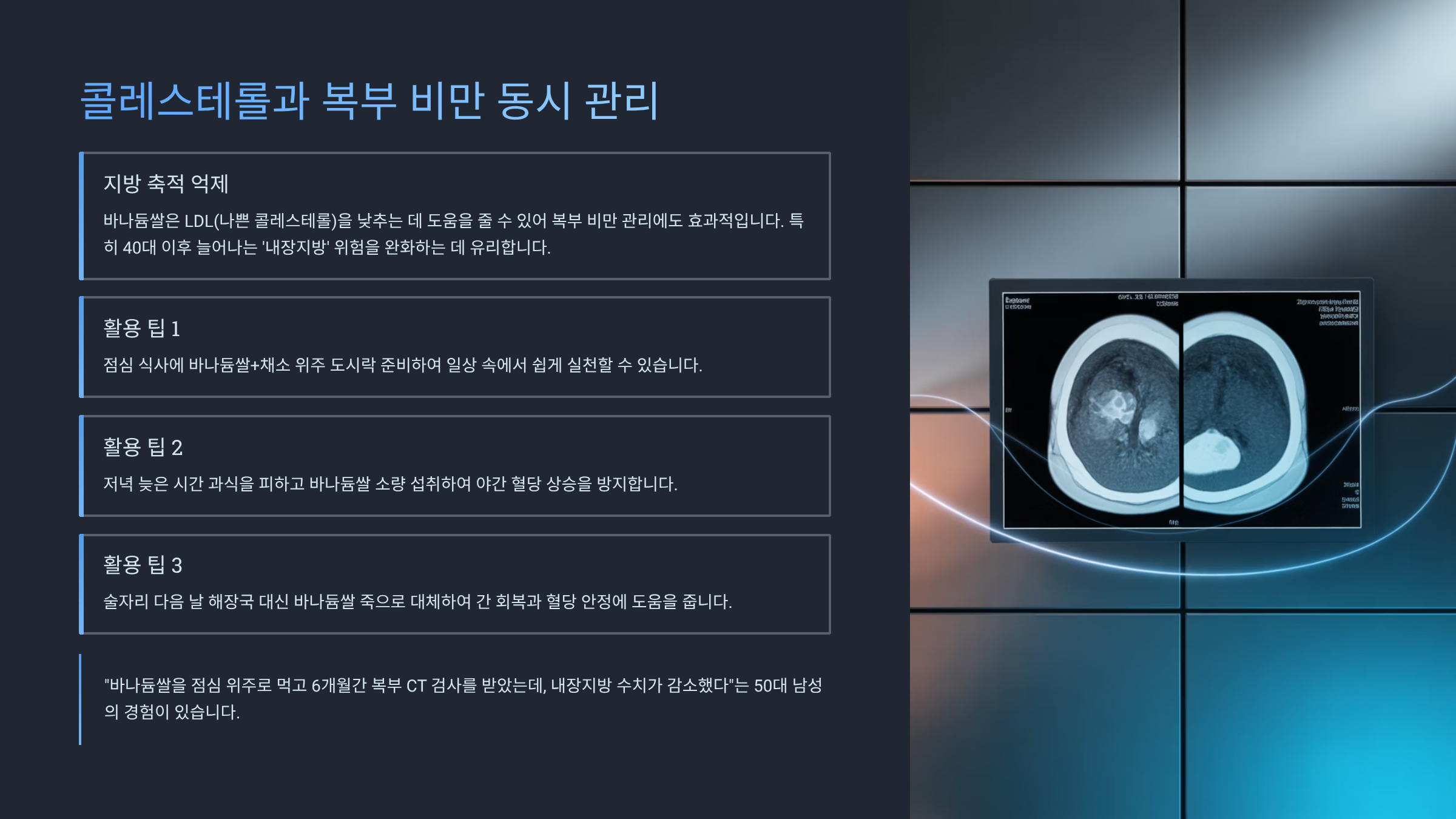 > 📌 실제 후기: “바나듐쌀을 점심 위주로 먹고 6개월간 복부 CT 검사를 받았는데, 내장지방 수치가 감소했다”는 50대 남성의 경험이 있습니다.