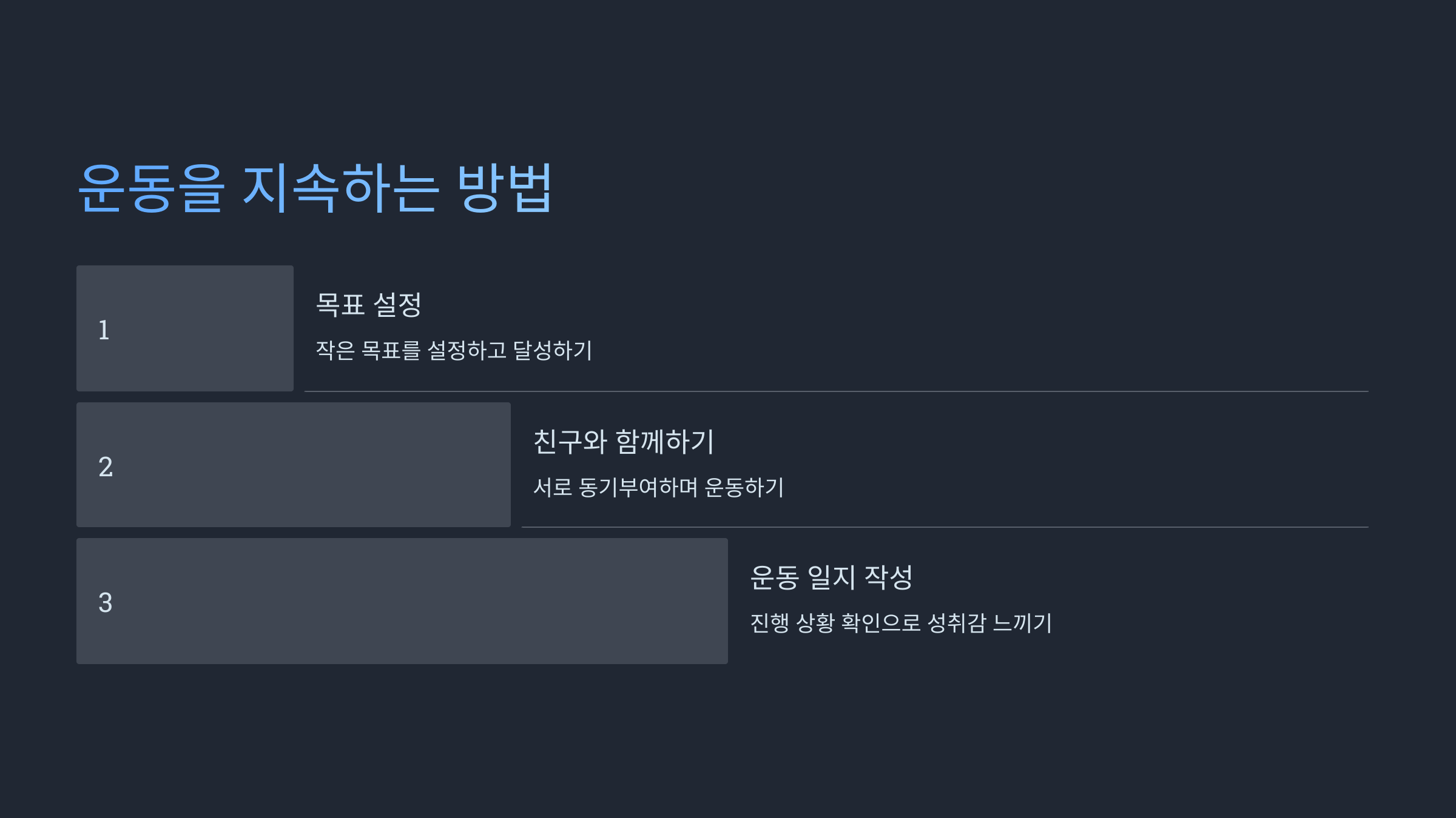 작은 목표를 설정하고 이를 달성하는 것이 중요합니다. 예를 들어, 매주 3회 운동하기와 같은 목표를 세워보세요.
