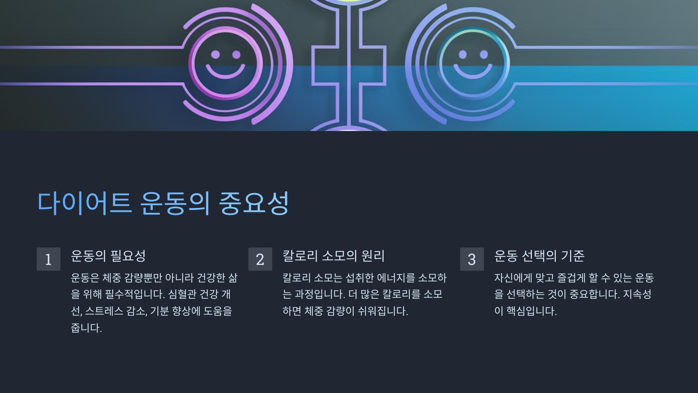 운동은 단순히 체중 감량을 위한 수단이 아닙니다. 건강한 삶을 위해 필수적입니다. 규칙적인 운동은 심혈관 건강을 개선하고, 스트레스를 줄이며, 전반적인 기분을 좋게 만듭니다.