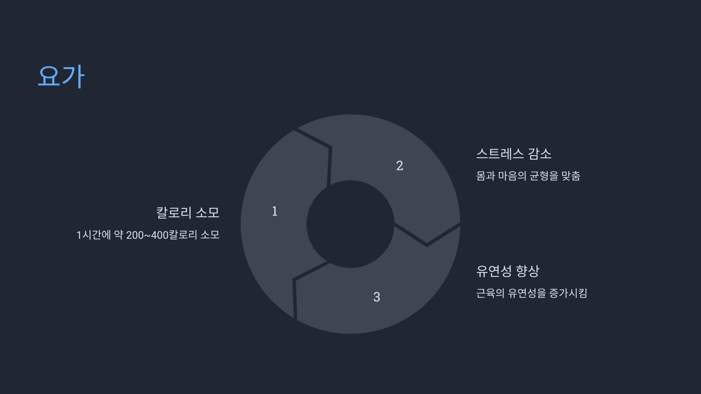 요가는 몸과 마음의 균형을 맞추는 데 도움을 줍니다. 1시간 요가를 하면 약 200~400칼로리를 소모할 수 있습니다. 스트레스를 줄이고, 유연성을 향상시키는 데 효과적입니다.