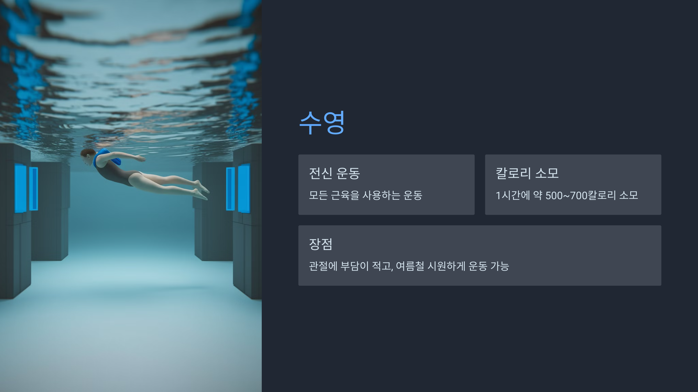 수영은 전신 운동으로, 모든 근육을 사용하게 됩니다. 1시간 수영을 하면 약 500~700칼로리를 소모할 수 있습니다. 물속에서 운동하기 때문에 관절에 부담이 적고, 더운 여름철에 시원하게 운동할 수 있는 장점이 있습니다.