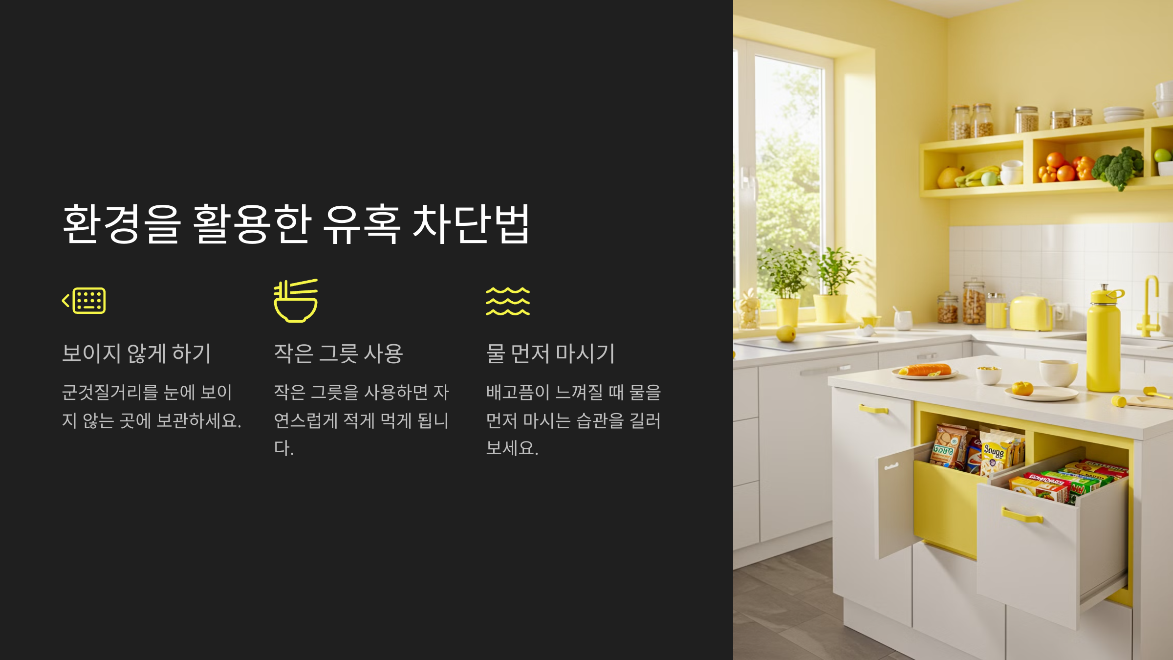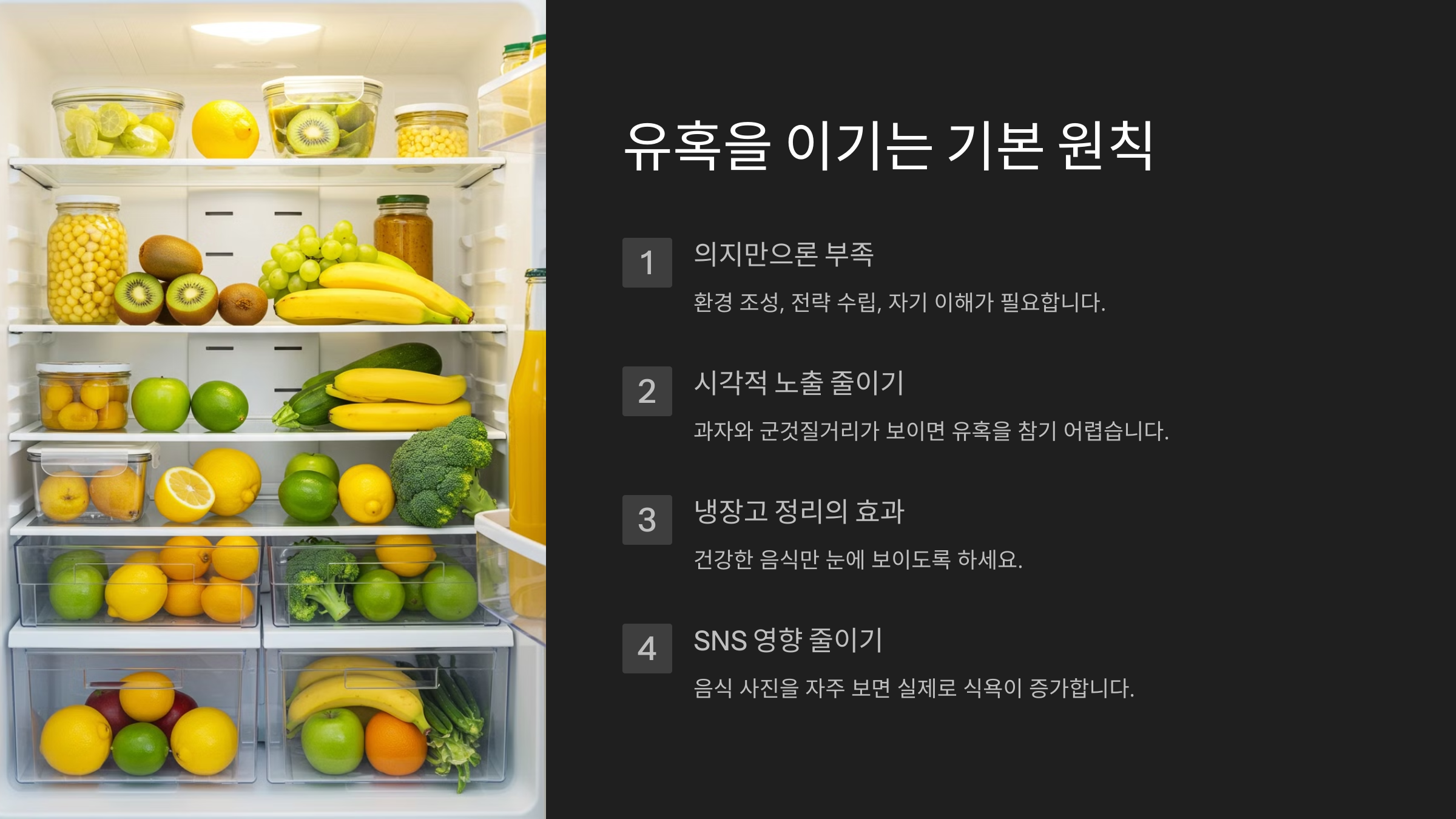 다이어트 중 유혹을 이기려면 의지만으로는 부족합니다. 환경을 조성하고, 전략을 세우며, 스스로를 이해해야 합니다. 99%가 모르는 핵심 원칙 중 하나는 바로 "시각적 노출 줄이기"입니다. 과자와 군것질거리가 보이는 곳에 있다면 유혹을 참기 어렵습니다. 냉장고 정리를 통해 건강한 음식만 눈에 보이도록 해보세요.