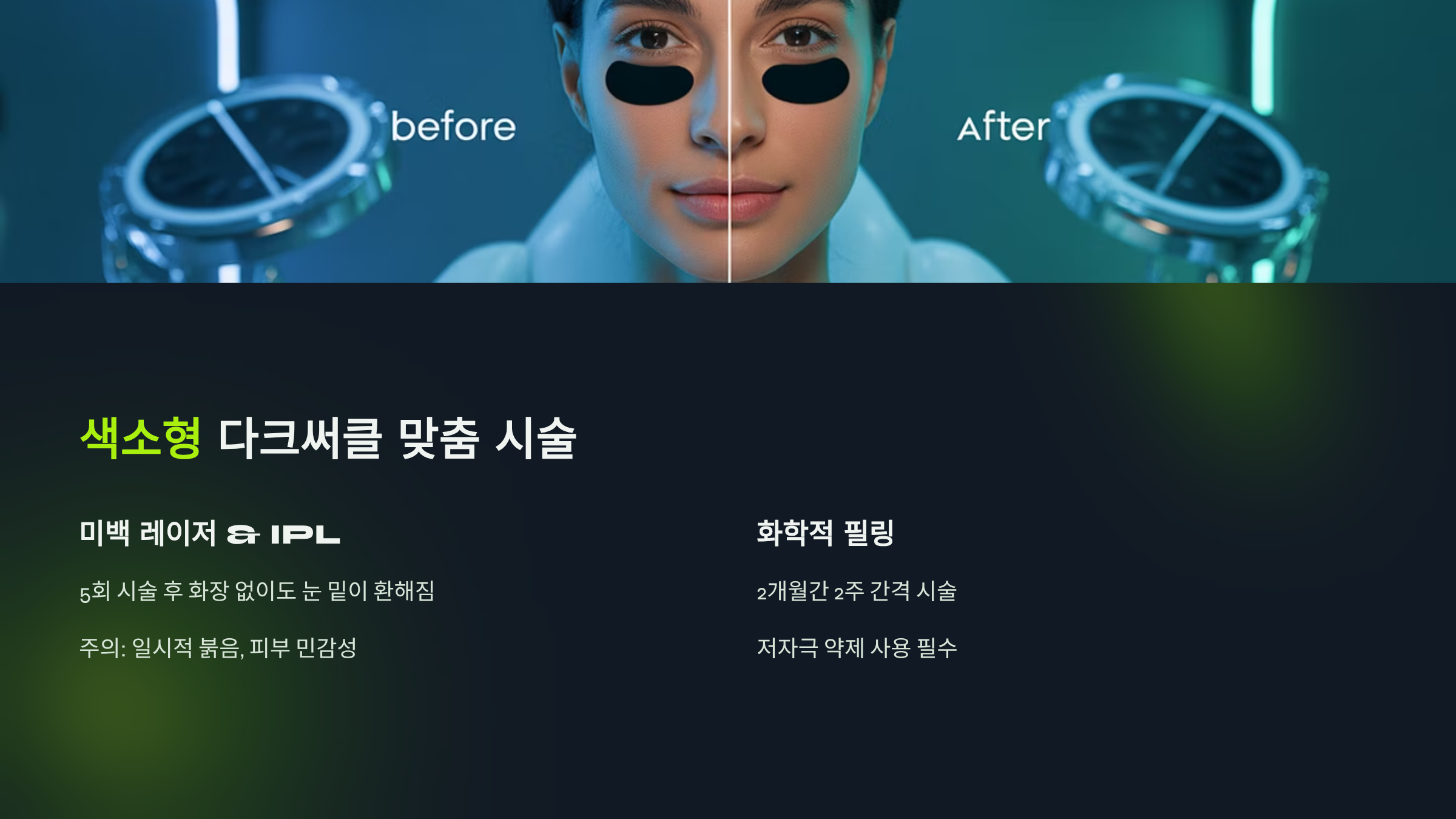 | 색소형 | IPL, 미백 레이저, 화학적 필링 | 피부톤 개선, 눈 밑 밝아짐 | 자극 위험, 꾸준한 관리 필요 |