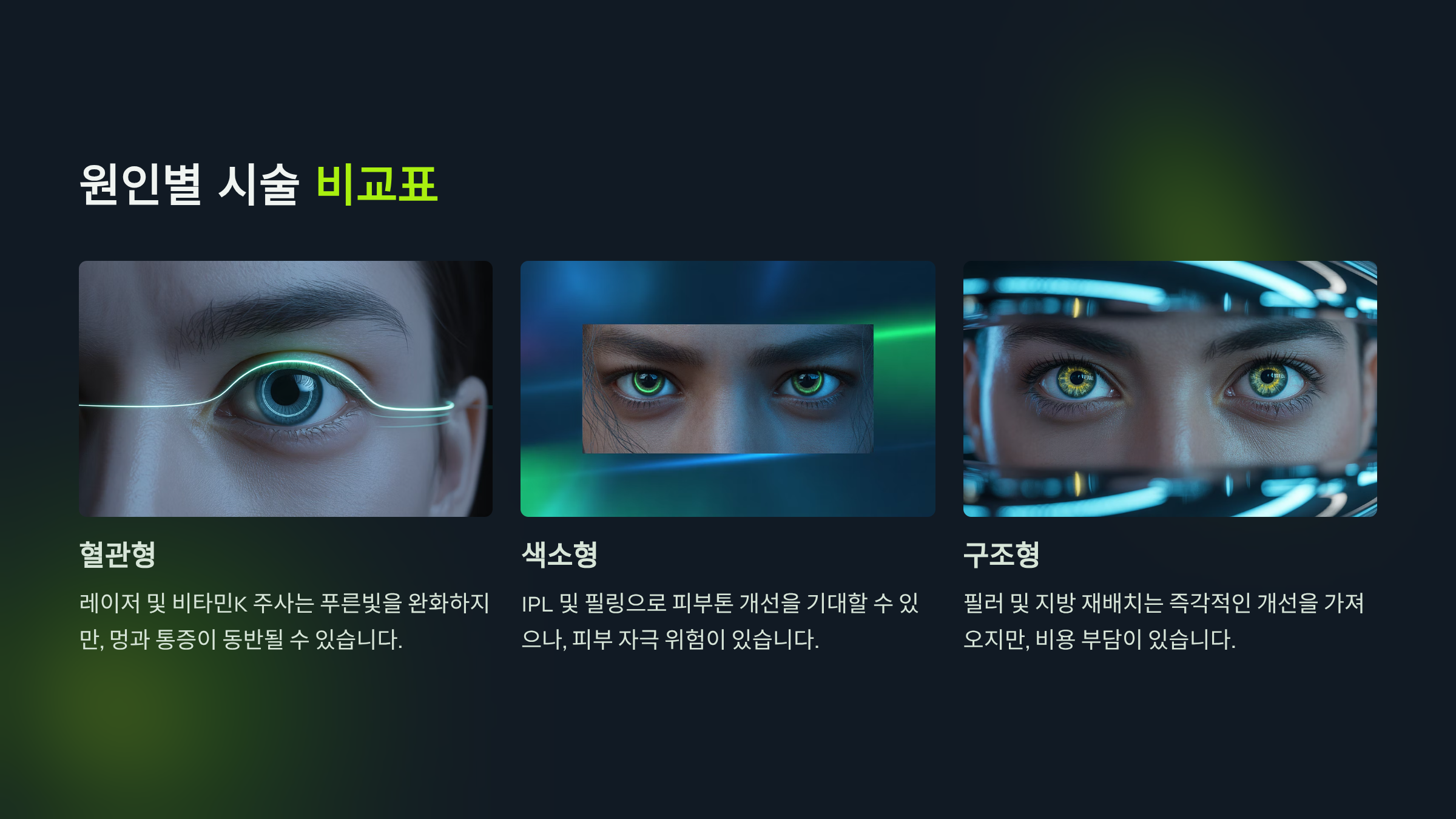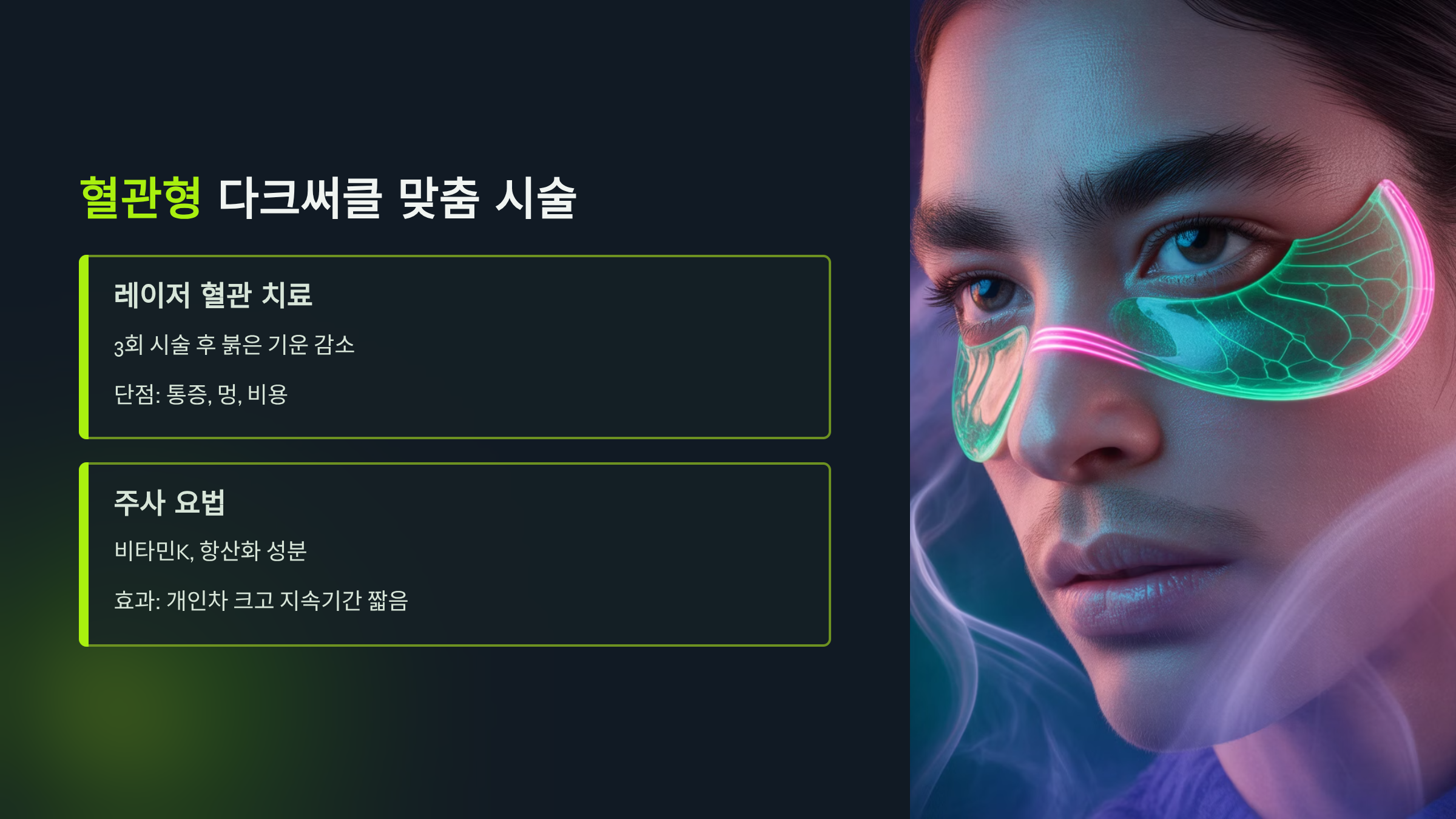 | 혈관형 | 레이저 혈관치료, 비타민K 주사 | 푸른빛 완화, 비교적 빠른 개선 | 멍·통증, 반복 시술 필요 |