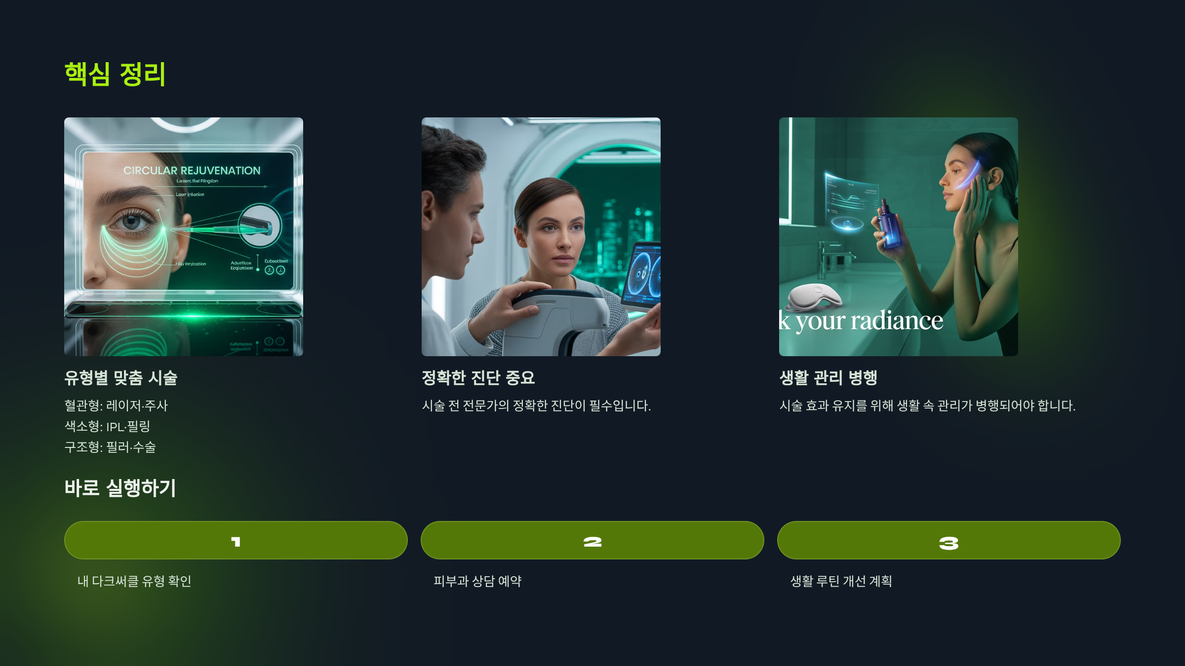 - 혈관형은 레이저·주사, 색소형은 IPL·필링, 구조형은 필러·수술이 효과적