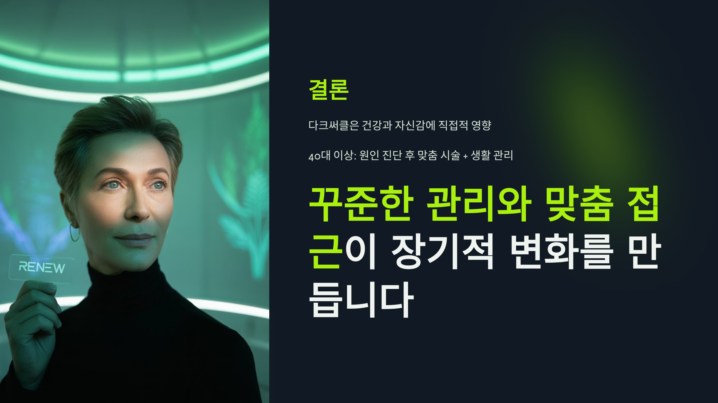 다크서클은 단순히 외모의 문제를 넘어 자신감, 사회적 인상, 나아가 건강까지 영향을 줍니다.