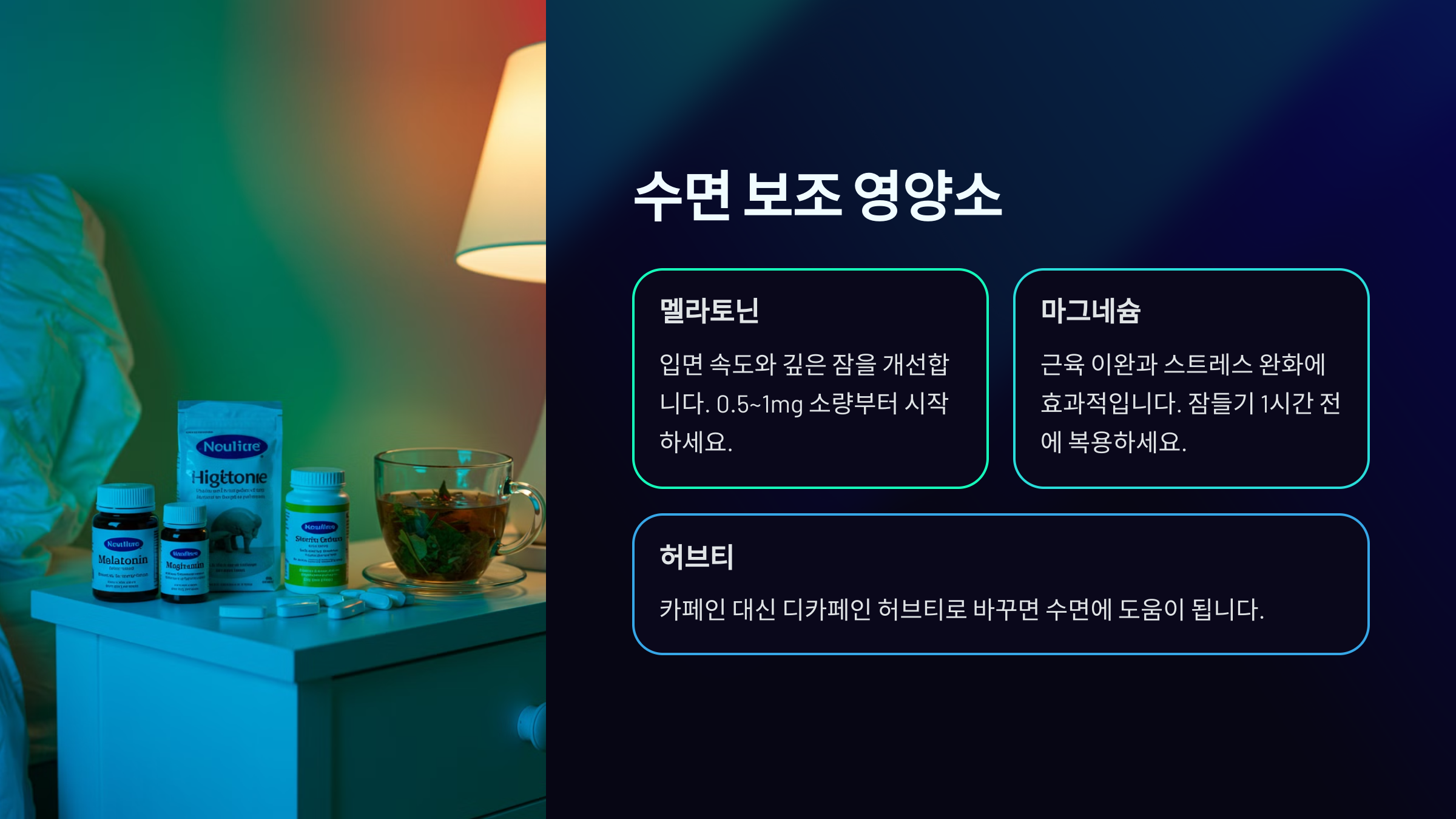 많은 리뷰에서 멜라토닌 보충제를 복용했을 때, 입면 속도와 깊은 잠이 개선되었다는 피드백이 확인되었습니다. 단, 고용량 복용은 피로감을 유발할 수 있으므로 0.5~1mg 소량부터 시작하는 것이 좋습니다. 마그네슘은 근육 이완과 스트레스 완화에 효과적이며, 잠들기 1시간 전에 복용하면 숙면에 도움이 됩니다.