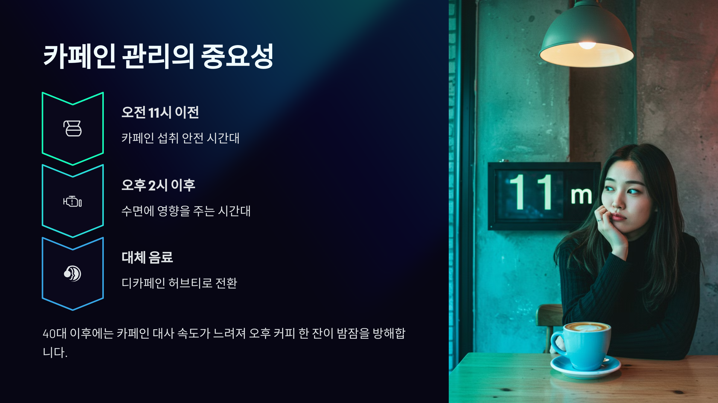 40대 이후에는 카페인 대사 속도가 느려져, 오후 2시 이후 섭취한 커피 한 잔이 밤잠을 방해합니다. 사용자 리뷰에서도 “커피 마신 날은 확실히 늦게 잠든다”는 의견이 많았습니다. 커피를 아예 끊기 어렵다면, 오전 11시 이전으로 섭취를 제한해 보세요. 티 종류를 디카페인 허브티로 바꾸는 것도 좋은 방법입니다.