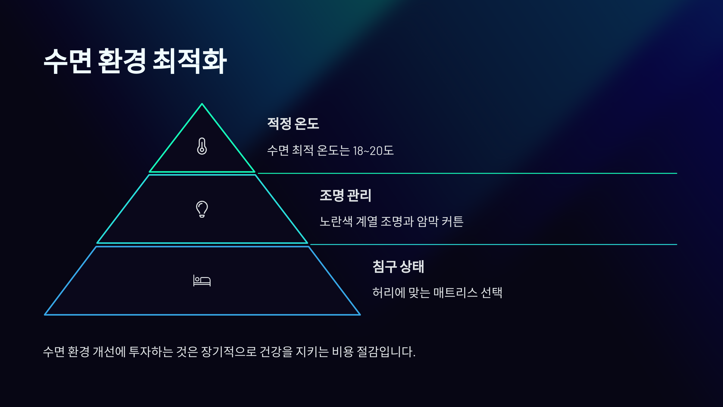조명, 온도, 소음, 습도, 침구 상태까지 모두 수면 질에 영향을 줍니다. 조명을 노란색 계열로 바꾸고, 암막 커튼을 설치해 빛 공해를 차단하세요. 또한, 침대 매트리스가 허리에 맞는지도 확인이 필요합니다. 장기적으로는 수면환경 개선에 투자하는 것이 건강을 지키는 비용 절감입니다.